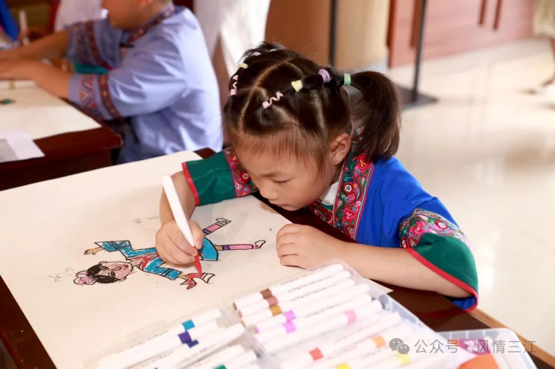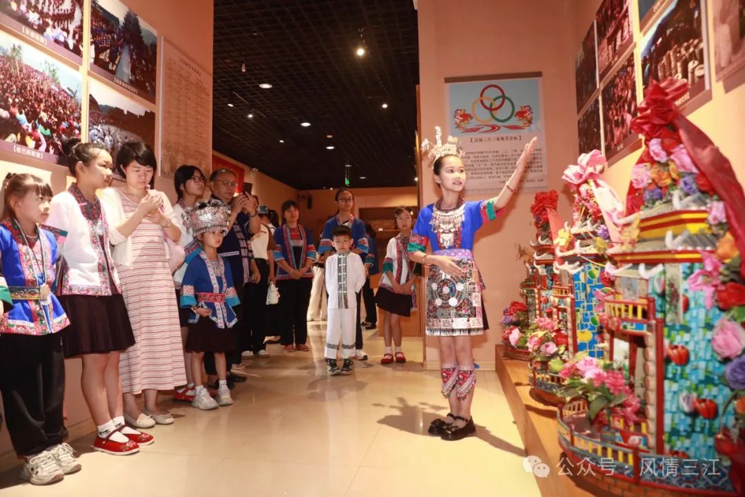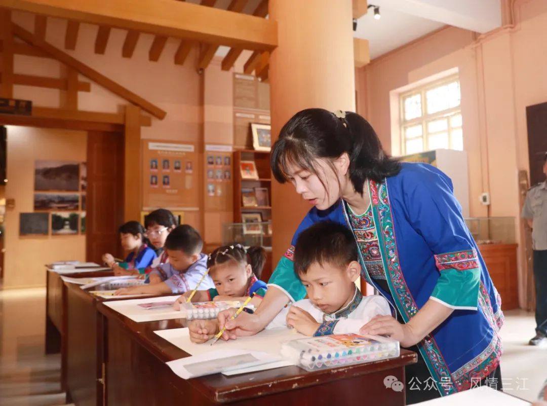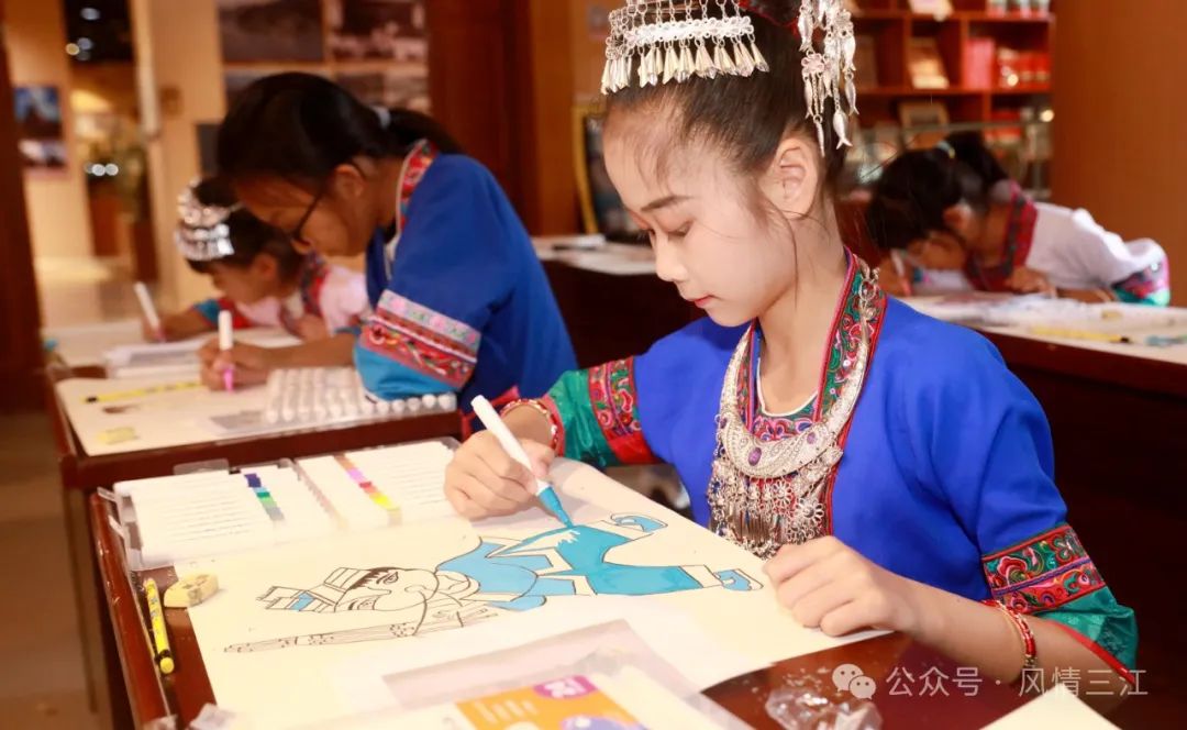 当天,县博物馆内热闹非凡。小小讲解员身着民族服装,自信地为观众讲解文物展品及其历史故事,稚嫩声音中透着坚定,引得观众驻足聆听、拍照记录。在侗族农民画体验课堂上,学生们在老师指导下,用画笔描绘侗族姑娘与小伙,姑娘服饰斑斓、笑容温婉,小伙身姿挺拔、眼神坚毅,画面展现出侗族生活的多彩场景,一幅幅充满生活气息的画作展现了侗族文化的独特魅力。