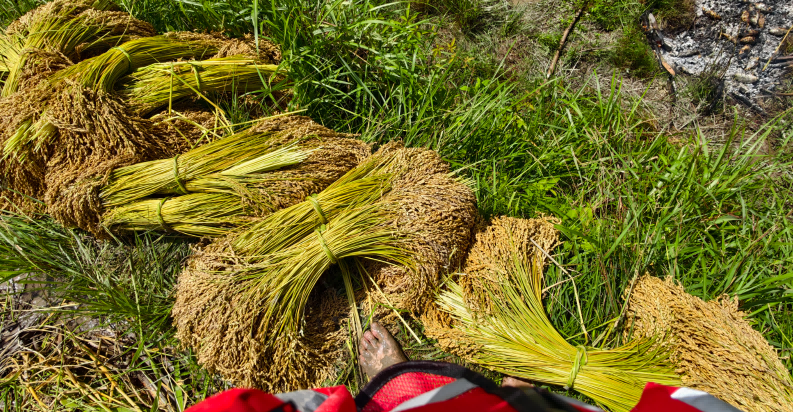 在忙碌的人群中,驻村工作组指导员李翰昌的身影格外醒目。他不仅是组织者,更是冲在最前头的“排头兵”。只见他动作麻利地将收割下的糯稻捆成结实的禾把,然后用扁担一趟又一趟地将沉重的禾把挑往集中点。