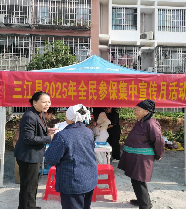 秋风送爽,丹桂飘香,秋风徐徐,九九重阳。10月29日,三江县医疗保障局组织志愿服务团队深入社区、村屯开展2025年全民参保集中宣传月活动,用通俗易懂的语言讲解,让社区、村屯老年人及居民群众清晰了解最新医保政策,如2026年度居民医保缴费标准、时间和方式,门诊报销和共济、慢特病报销、异地就医备案等等。提供“一对一”、“手把手”医保优质服务,面对面为老年人及居民群众解答医保在使用中遇到的实际问题,帮助老年人激活和使用医保电子凭证,增强老年群众维护自身医保权益的意识,防范医保诈骗。