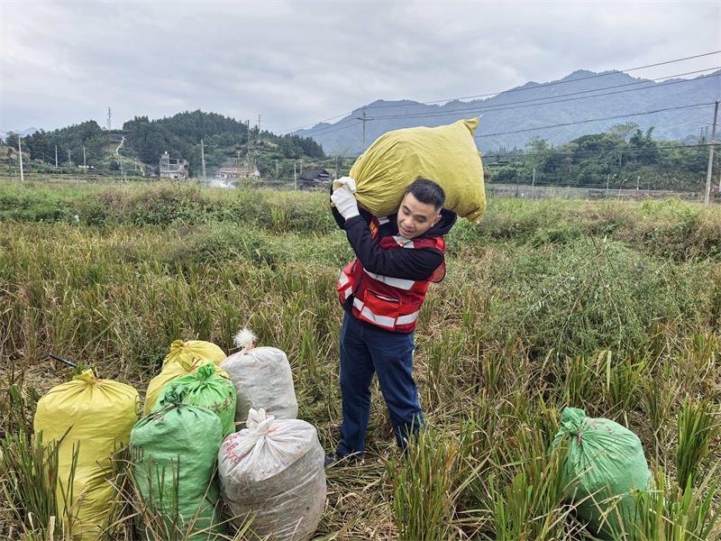 余大姐家中共两口人,其本身患聋哑,孩子在校读书,家庭劳动力匮乏。为确保粮食颗粒归仓,减轻她的负担,工作队员们二话不说,卷起裤脚,拿起镰刀,纷纷下到田里帮忙收割稻谷。收割完毕后,工作队又贴心地将一袋袋的稻谷搬运上车,安全运送至余大姐家中。