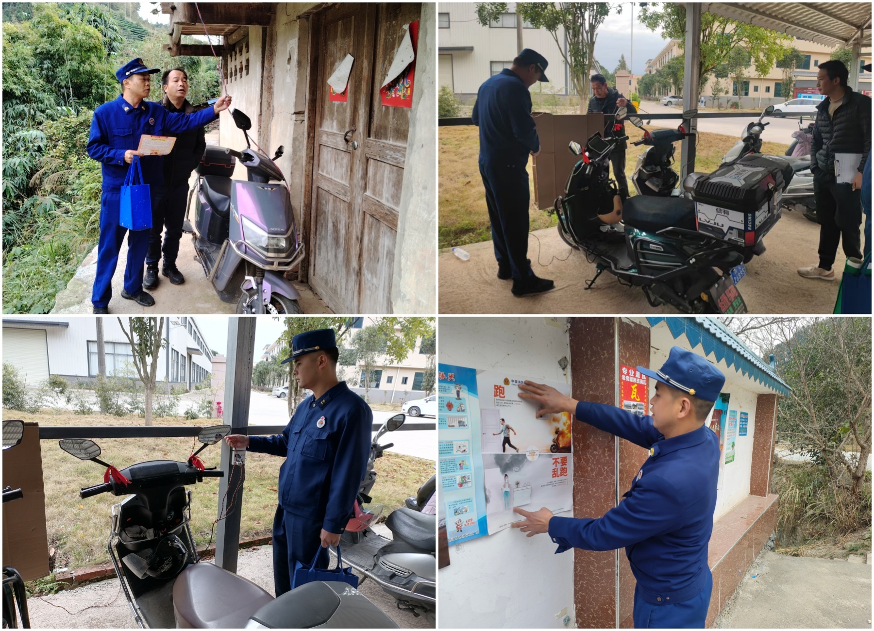 大队组织专职消防队员、乡镇工作人员、社区网格员及志愿者等基层力量,深入乡村街道、居民小区、高层住宅、“九小场所”、市场等人员密集区域,以张贴宣传海报、发放宣传资料、现场答疑解惑等方式,宣传电动自行车进楼入户、占用消防通道、电池入室充电的危害。结合近年来电动自行车火灾典型案例,以案示警、以案释法,针对商铺经营者、老年群体等安全意识相对薄弱人群,普及充电时长控制、日常检查保养、突发火情应对等实用知识。