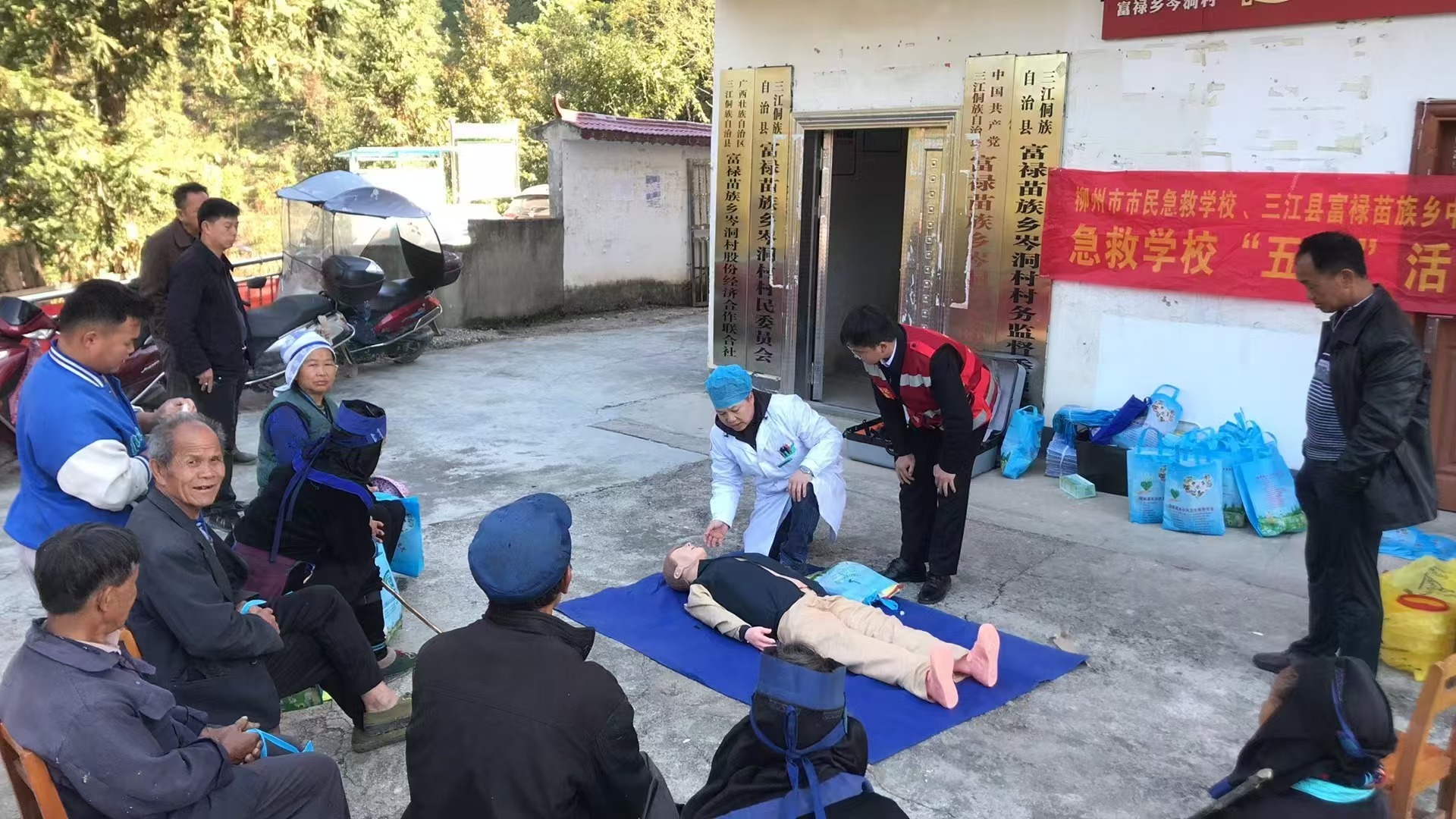 “大家看,按压胸部时要双手交叠,掌根用力,深度至少5厘米,频率保持在每分钟100到120次……”2025年11月28日,湘桂黔三省交界的岑洞村内人头攒动,富禄乡中心卫生院的滚荣峰医师正给村民们认真讲解急救知识,手把手指导村民操作心肺复苏。当天上午,岑洞村“两委”联合富禄乡中心卫生院开展的急救知识“五进”宣传活动在此举行,为岑洞村村民送上了一份“移动急救包”。