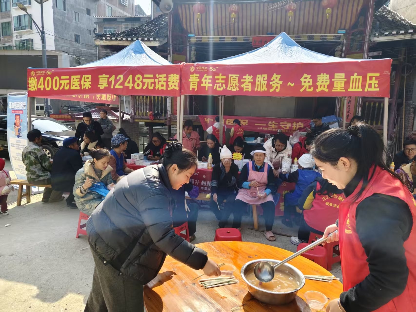 活动现场,工作人员为村民带来了全面细致地2026 年医保政策讲解以及话费补贴福利活动(现场缴纳一人 400 元医保,即可向移动公司申请1248元)。惠民政策与暖心福利的配合下,村民们的积极响应。更为温暖的是中国移动三江分公司还在现场煮起了热气腾腾的汤圆,工作人员与村民们围坐在一起,一边品尝汤圆,一边交流着惠民政策,医保缴纳率显著提升。
