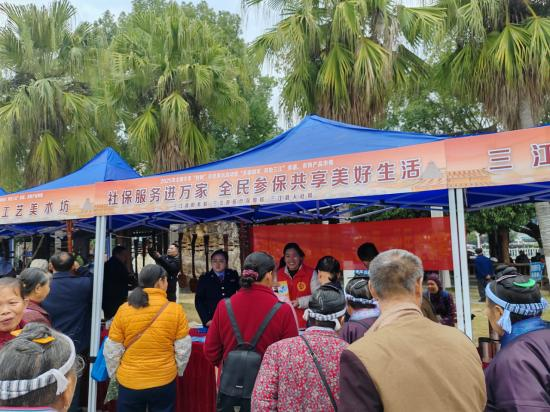 12月20日,2025年全国冬季“村晚”示范展示活动暨“多耶侗年·月也三江”非遗展示、“多耶”比赛、农特产品集市活动在三江侗族自治县县城的多耶广场拉开帷幕,来自四面八方的广大群众齐聚多耶广场,共同欢庆佳节。三江侗族自治县人社局紧紧抓住这个良好契机,巧借“侗年”这个载体,联合税务、医保等部门开展了“社保服务进万家·全民参保共享美好生活”宣传活动,取得了良好效果。