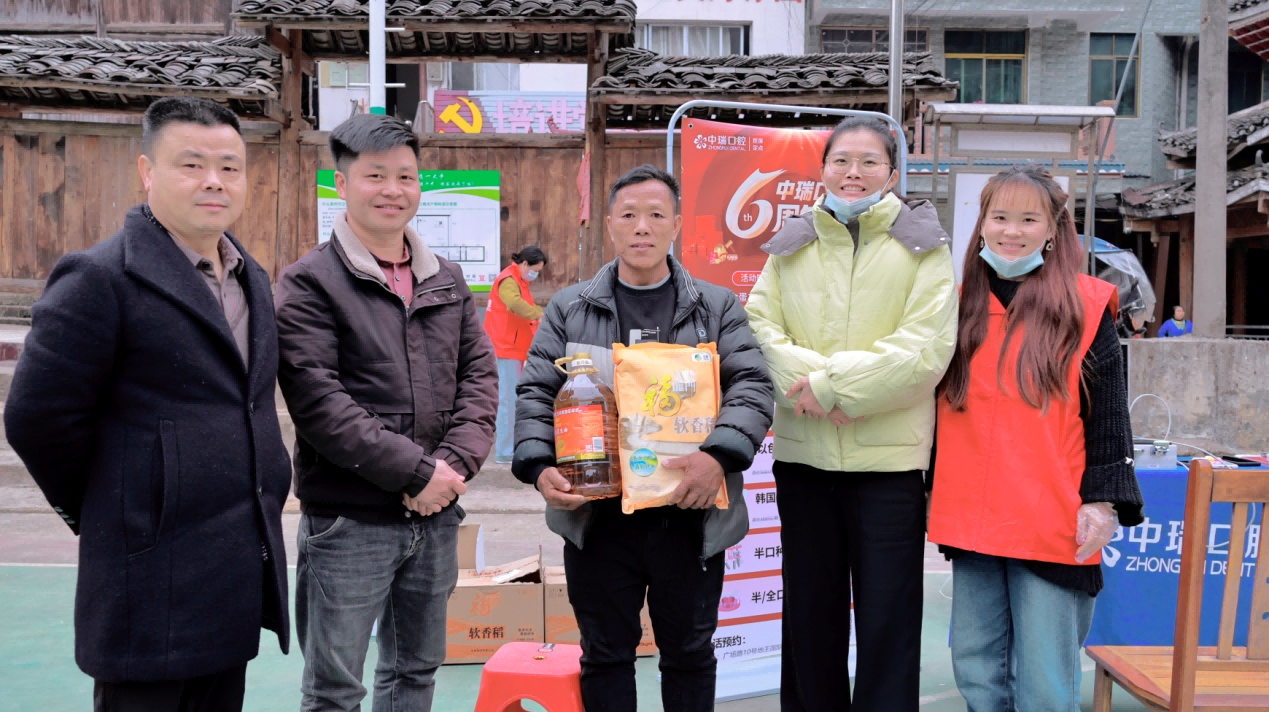 活动现场,四位身着红马甲的口腔医生耐心地为闻讯而来的村民进行细致的牙齿检查,并用专业仪器进行初步诊疗。他们一边操作,一边用通俗易懂的语言讲解口腔保健知识,解答大家关于牙齿健康的各类疑问。等候检查的群众有序排队,现场气氛热烈而融洽。每位参与检查的村民都收到了一份精美的礼品,而10位家庭困难的老人更是额外获赠了大米、食用油等实用的慰问品,脸上洋溢着感激的笑容。