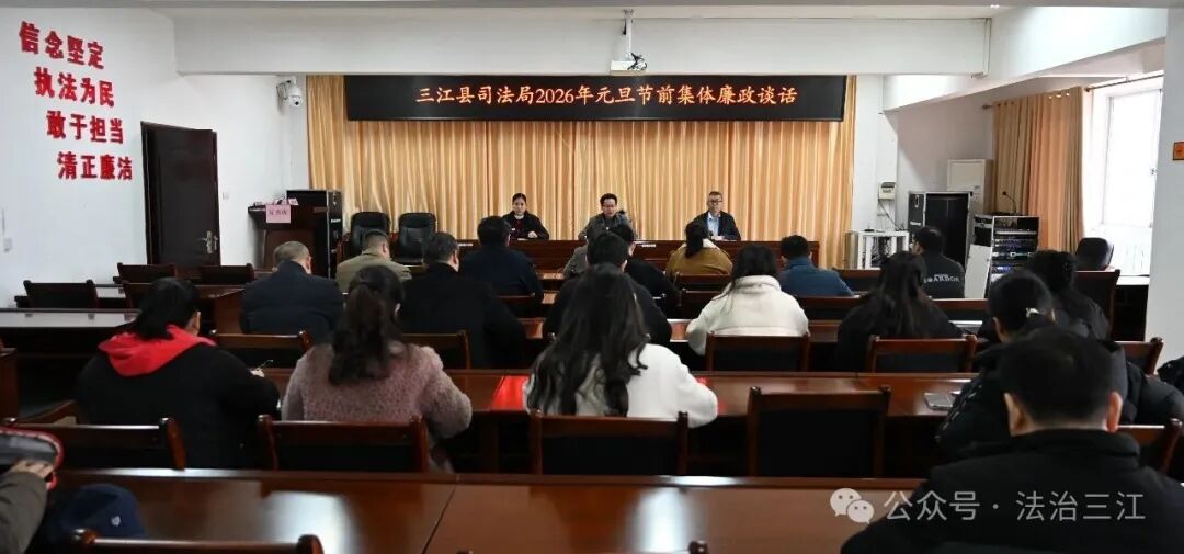 为深入贯彻全面从严治党要求,切实筑牢节日期间廉洁防线,12月31日,三江侗族自治县司法局召开元旦节前廉政集中谈话会。局领导班子成员、各股室及司法所负责人参加会议,局党组书记、局长侯孟良主持会议并传达学习中共中央政治局12月25日召开研究部署2026年党风廉政建设和反腐败工作会议精神。