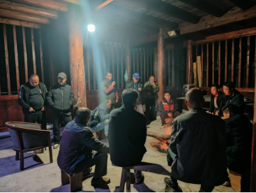 鼓楼内,火光跃动,村干、驻村工作队与寨佬围坐一堂。寨佬沉稳主持议事,空气中弥漫着坦诚相待、互帮互助的温情。驻村工作队与村干首先阐明核心立场:保障每一位寨邻的饮水安全,是全寨人不可推卸的共同责任,传递出“一家断水,全寨关切”的侗寨团结理念。随后,工作人员巧妙引导双方回顾侗族古训中关于互助、共享与邻里和解的智慧,将现代社会的公平公正原则与侗寨传承已久的“互谅互让”伦理精神有机结合,让议事过程既有法理依据,更具情感温度。