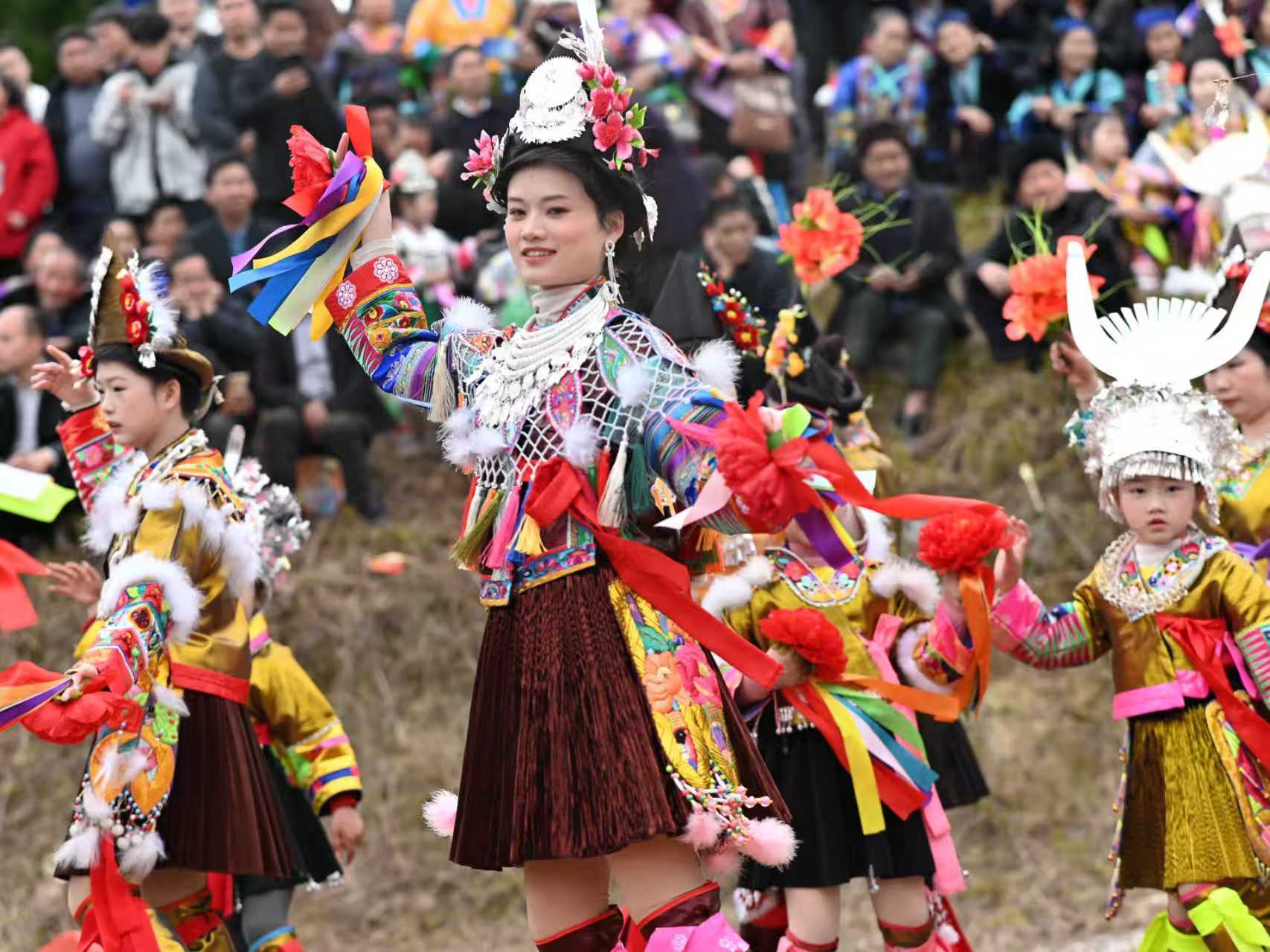 活动现场,苗乡同胞身着绚丽盛装,芦笙队列阵比响,浑厚绵长的笙声此起彼伏、铿锵悦耳,尽显苗族芦笙技艺的独特魅力。伴着悠扬笙乐,苗族姑娘小伙踏歌起舞,银饰叮当、舞步轻盈,刚健与柔美交织,现场观众或和乐拍手、或加入起舞,山坡之上锣鼓喧天、欢声笑语,成为一片欢乐的海洋,尽显苗寨新春的热闹与喜庆。