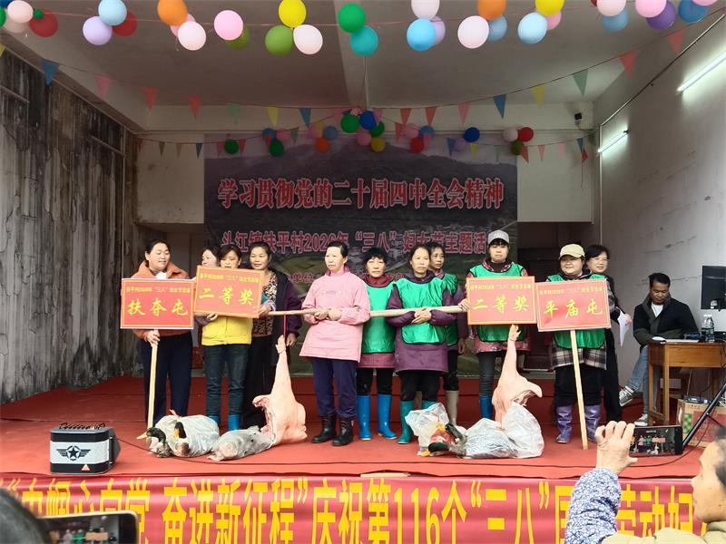 比赛结束后,村里为获胜者颁发了别出心裁的奖品——新鲜的猪肉和土鸭。这些接地气的奖品不仅实用,更增添了节日的喜庆气氛。随后,一场由村民自编自导自演的文艺汇演精彩上演,歌舞、舞台剧等节目轮番登场,充分展示了扶平村妇女积极向上、多才多艺的精神风貌,赢得了现场观众的阵阵掌声。