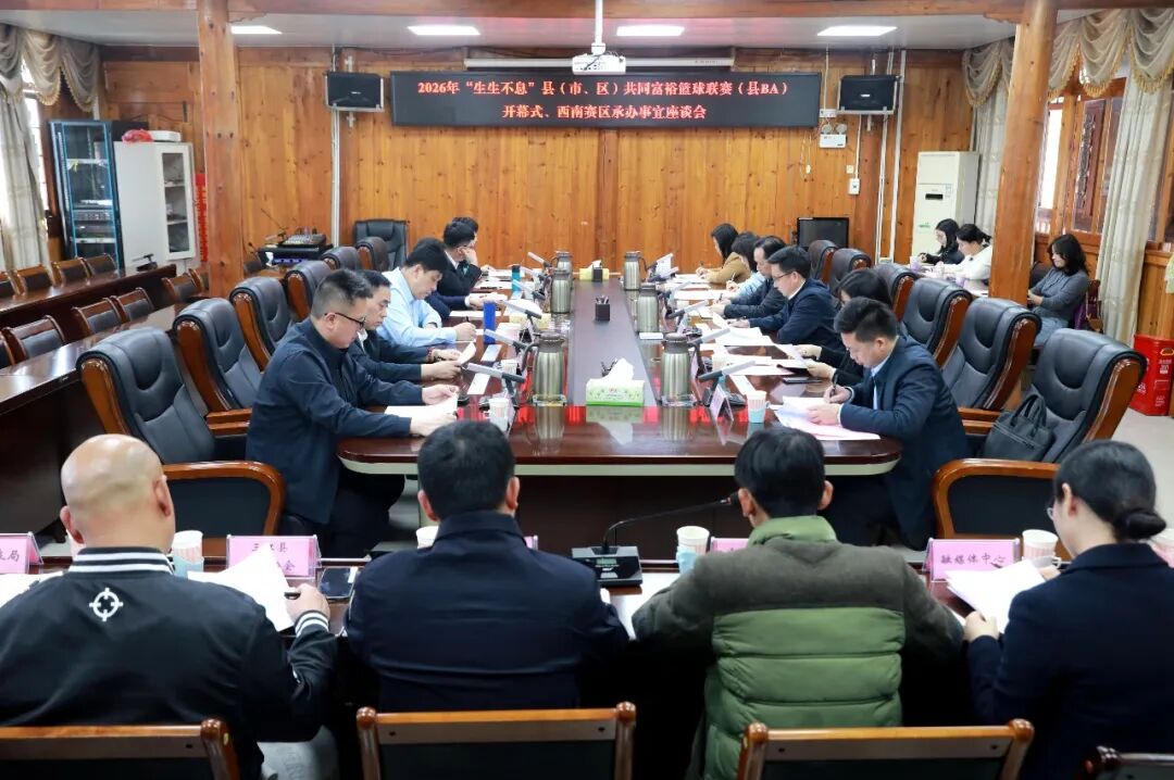 3月11日,2026年“生生不息”县(市、区)共同富裕篮球联赛(县BA)开幕式、西南赛区承办事宜座谈会在三江侗族自治县召开。“生生不息”县(市、区)篮球协会会长论坛理事会理事长、中国互联网协会智慧体育工委会副主任袁文蔚,县领导荣家飞、邱阳军、吴明焕、吴隆参加活动。