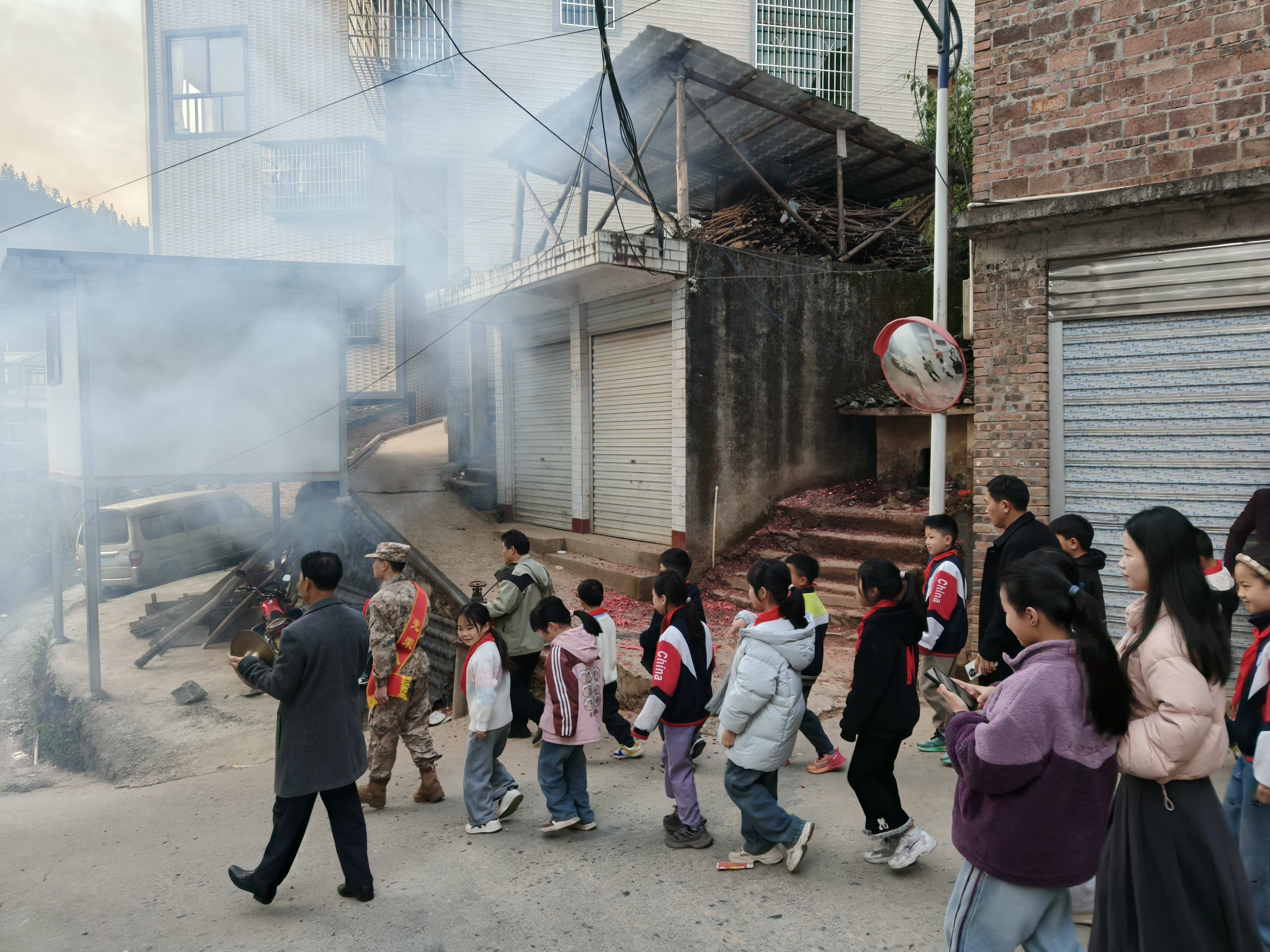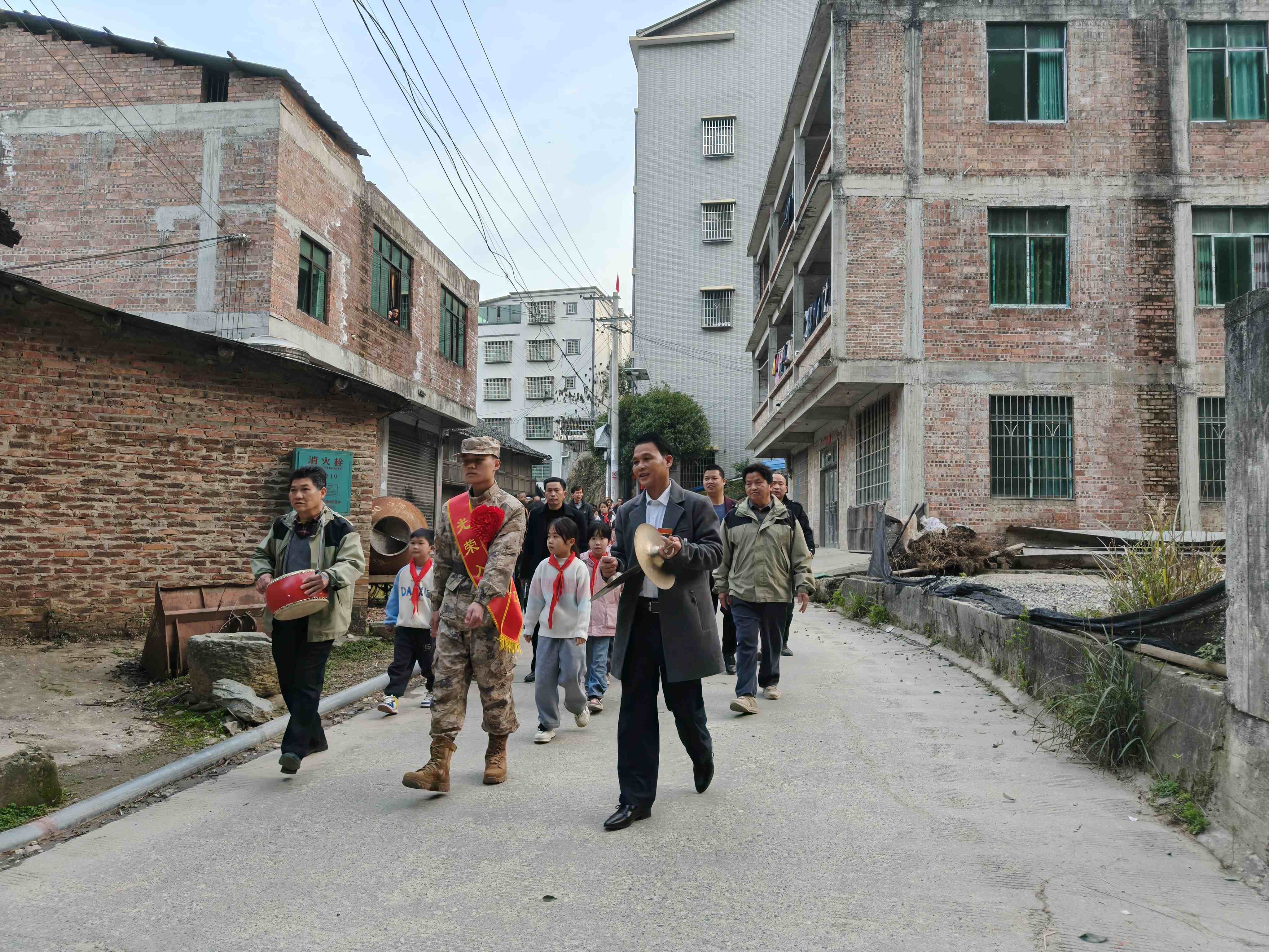 送行队伍从高洋村小学出发,沿着村道缓缓前行。身着迷彩服、身披“光荣入伍”绶带的新兵走在队伍中央,身旁是敲锣打鼓的父老乡亲、佩戴红领巾的少先队员以及一路护送的村“两委”干部与驻村工作队员。大家脸上洋溢着自豪与喜悦,用最质朴的方式表达着对新兵的祝福与期盼,一路护送到村寨大门。