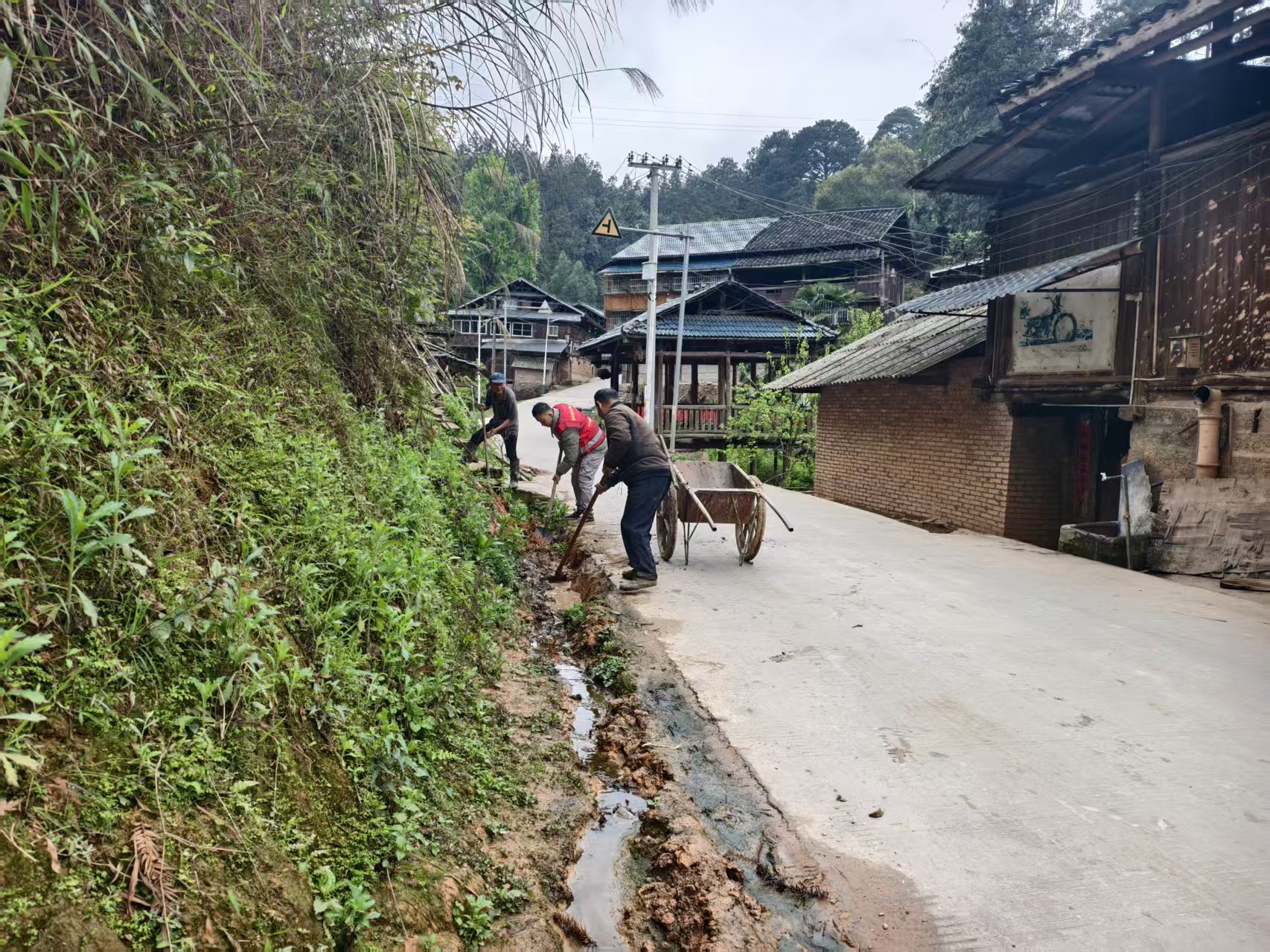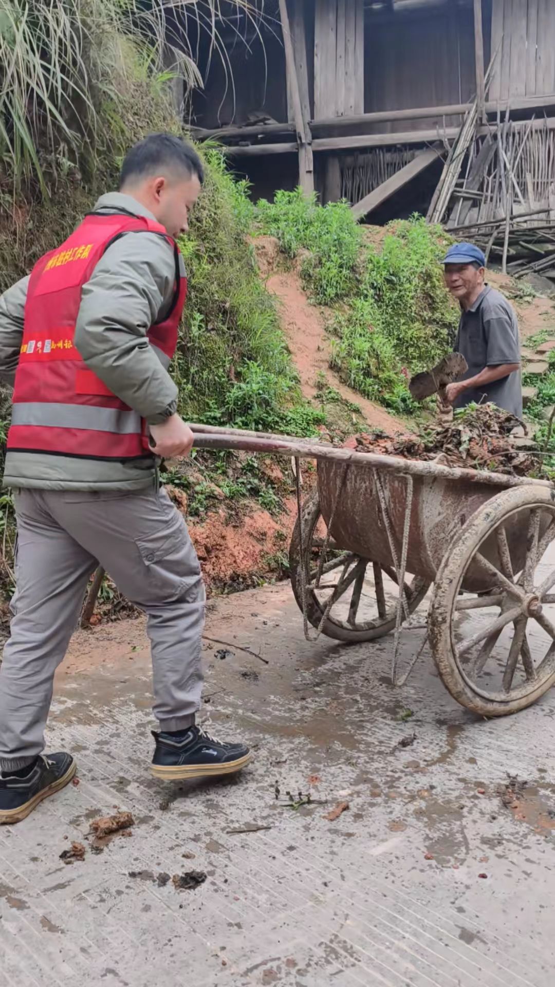 清理现场,党旗高高飘扬,干劲十足。驻村工作队全体队员、第一书记、村“两委”干部率先垂范、冲锋在前,挽起裤脚、踏进淤泥,带头拿起铁铲、锄头、推车等工具,全力投入清理工作。大家分工协作、各司其职,有的挥锹铲除板结的淤泥和塌方石块,有的弯腰清理沟内杂物,有的推车转运废弃物,不顾沟内刺鼻的腥臭味,不顾淤泥沾满衣衫、汗水浸湿衣背,始终坚守一线、埋头苦干,用实际行动作出表率。