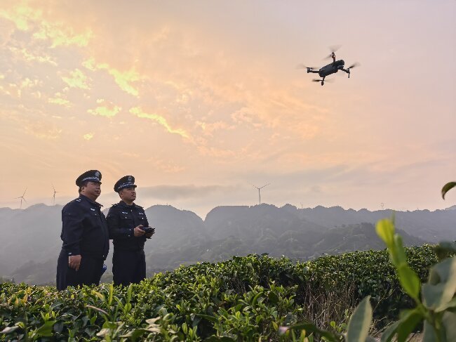 同时,警用无人机开启“空中”守护模式:不仅紧盯自然灾害、盗窃茶叶等风险,更承担起禁种铲毒的空中巡查任务,对茶园周边及偏远山区进行拉网式航拍监测,确保毒品原植物“零种植、零产量”。无人机还化身“空中宣传员”,用侗语和普通话“双语”在田间地头循环播报安全知识:“头盔戴好,平安出行”“陌生链接不点,转账汇款多核实”,让安全提示“声”入人心。