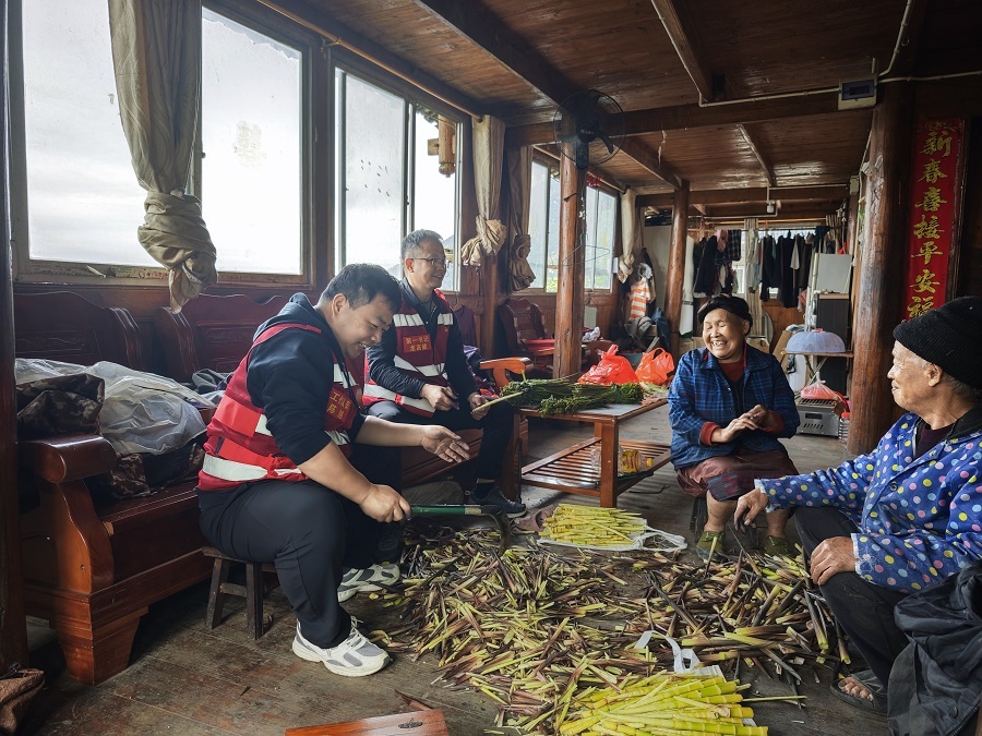 最热闹的一幕发生在监测户宛大爷家中。工作队刚到门口,就看见两位老人正在打包刚从山上摘回来的蕨菜和竹笋。原来,他们打算自己拿到街上去卖。考虑到两位老人年纪大、上街不便,工作队二话不说,撸起袖子帮忙整理起来:有的负责把蕨菜扎成小捆,有的蹲在地上给竹笋剥皮。不一会儿,一地的山货就收拾得整整齐齐。