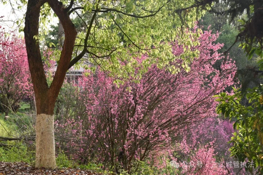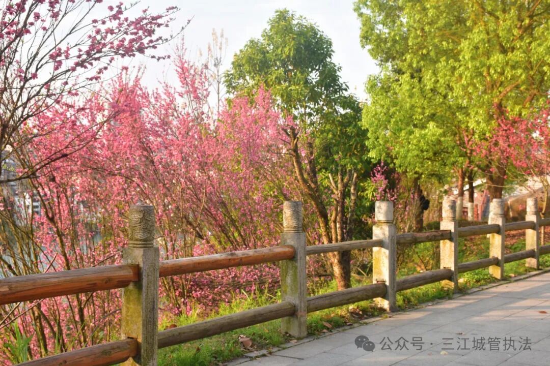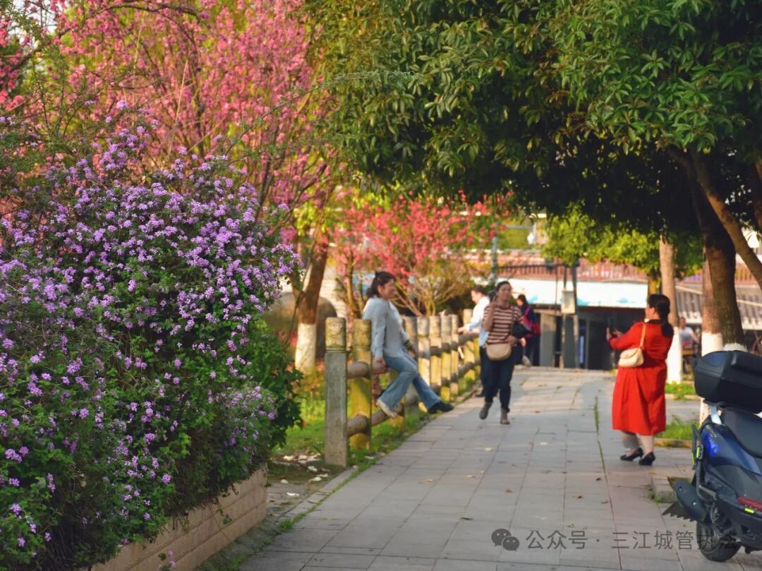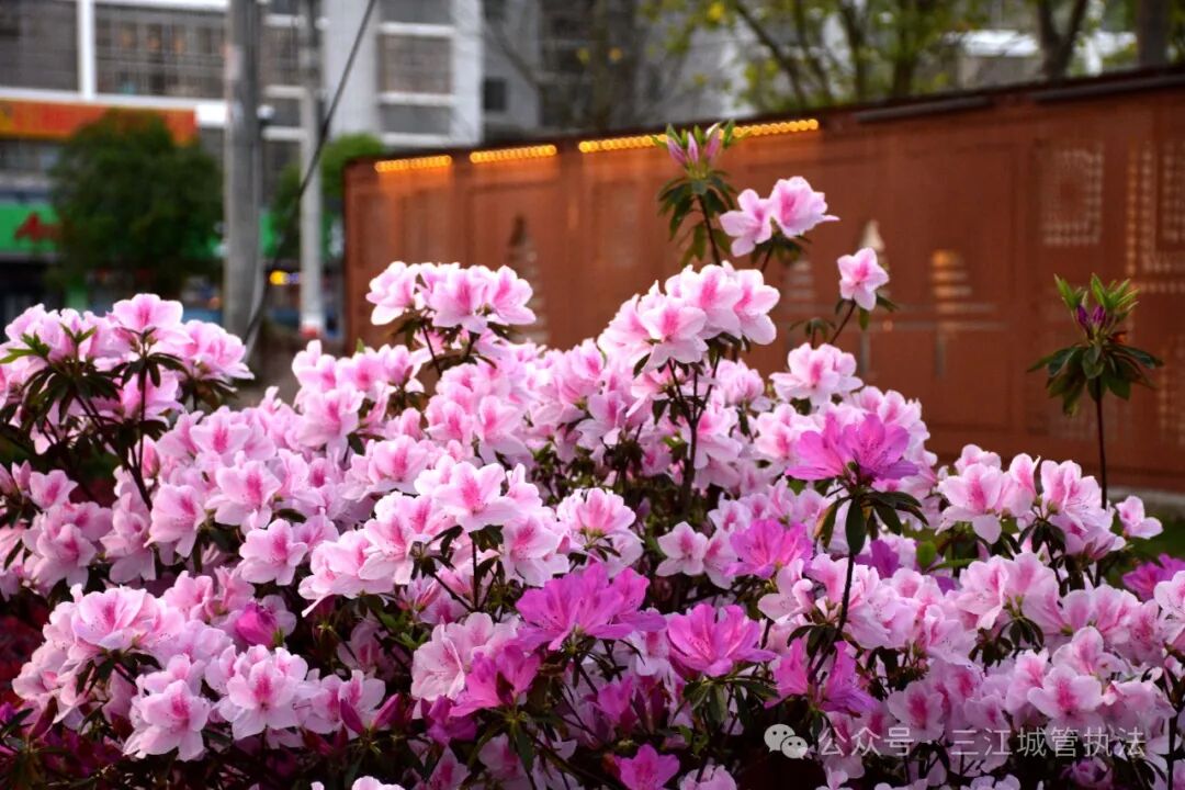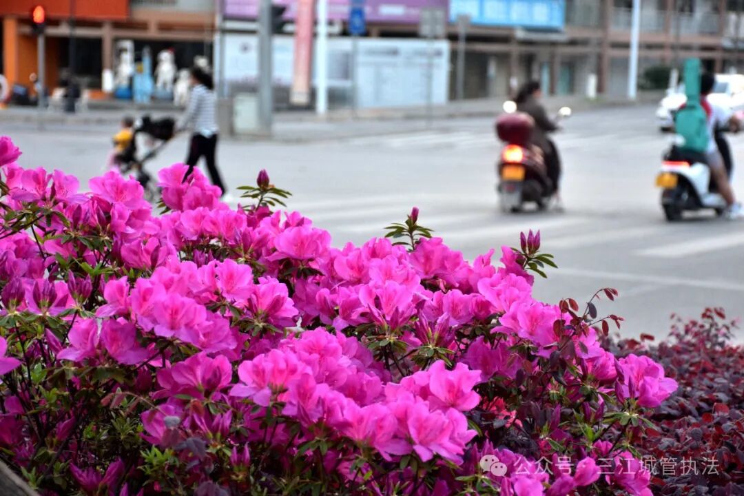 福桥西路杜鹃、桃花、樱花、马缨丹花开正浓,花香随风飘散、沁人心脾,给市民和游客带来了美好心情