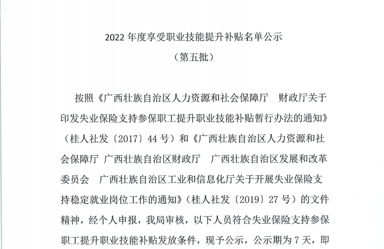 2022年度享受职业技能提升补贴名单公示(第五批)