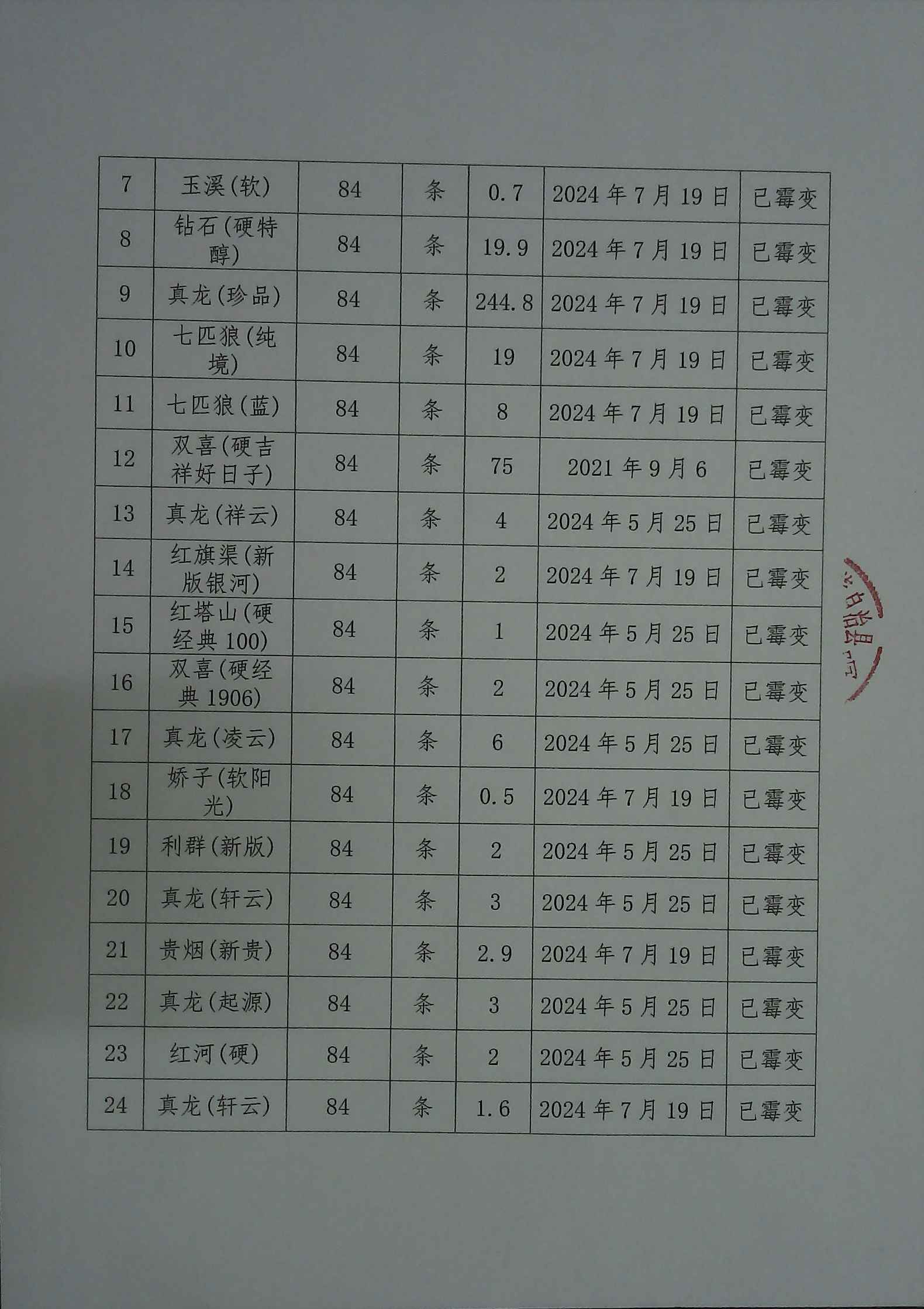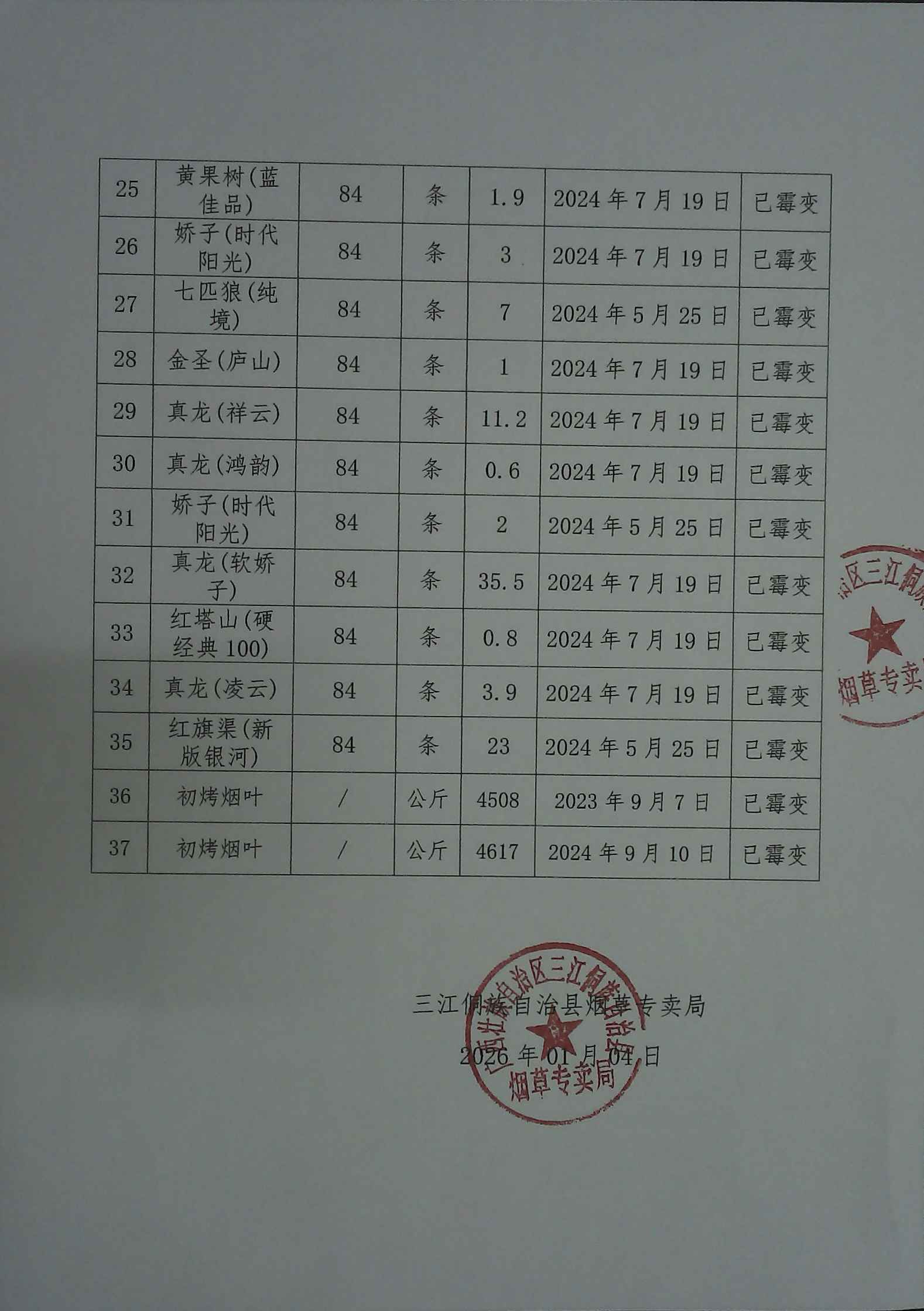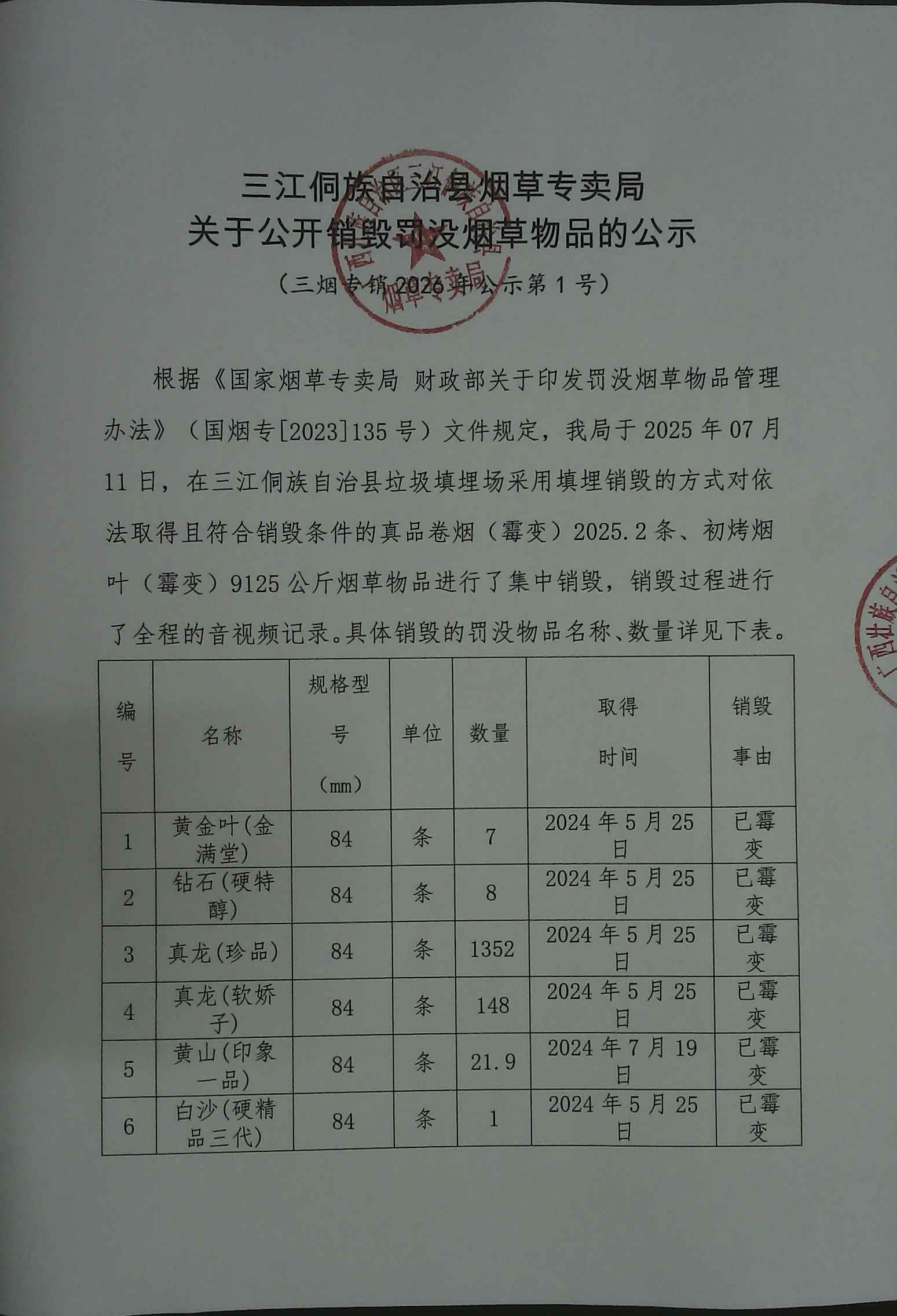 根据《国家烟草专卖局 财政部关于印发罚没烟草物品管理办法》(国烟专[2023]135号)文件规定,我局于2025年07月11日,在三江侗族自治县垃圾填埋场采用填埋销毁的方式对依法取得且符合销毁条件的真品卷烟(霉变)2025.2条、初烤烟叶(霉变)9125公斤烟草物品进行了集中销毁,销毁过程进行了全程的音视频记录。具体销毁的罚没物品名称、数量详见下表。