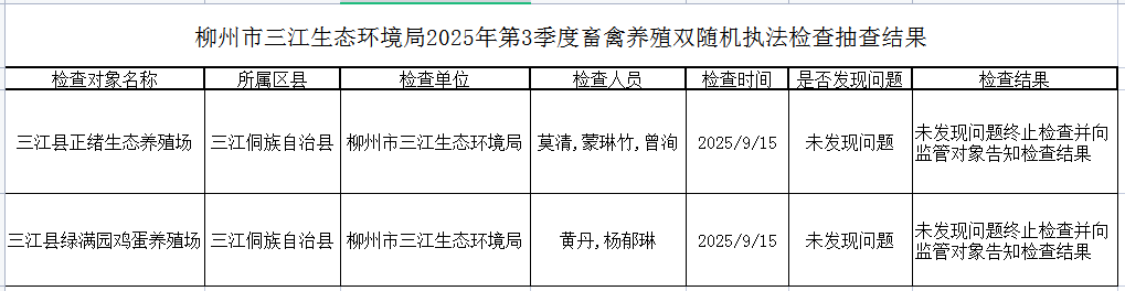 柳州市三江生态环境局2025年第3季度畜禽养殖双随机执法检查抽查结果