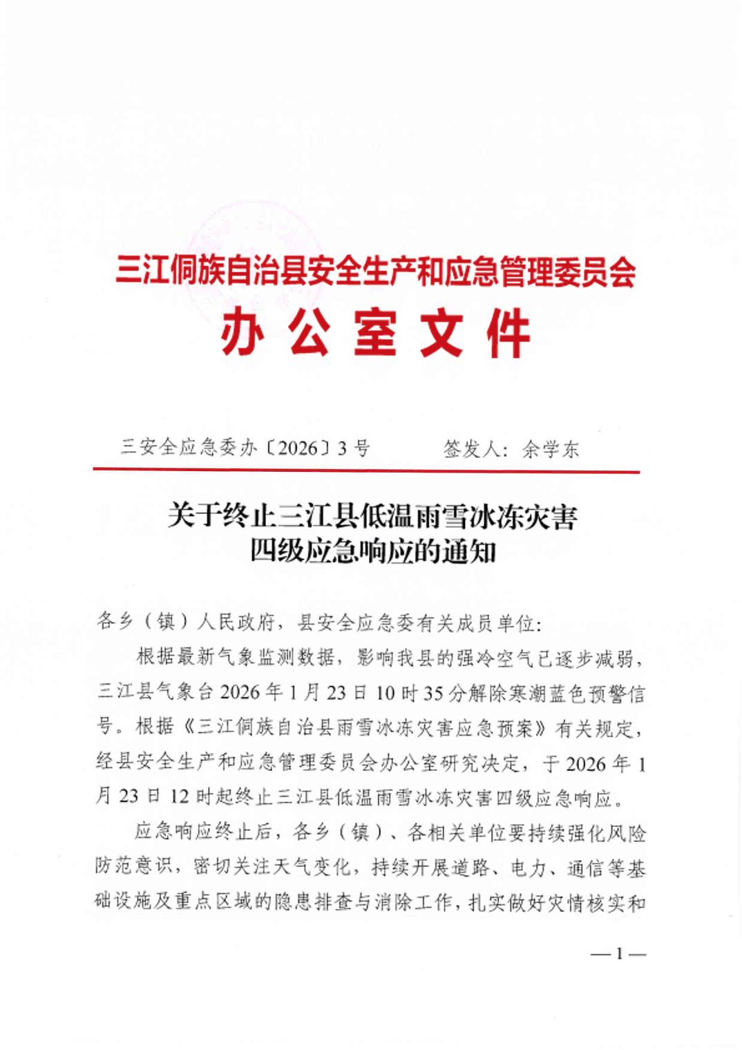 关于终止三江县低温雨雪冰冻灾害四级应急响应的通知