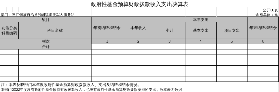 三江侗族自治县独峒镇退役军人服务站2022年度没有政府性基金收入,也没有政府性基金安排的支出,故无数据情况说明。。