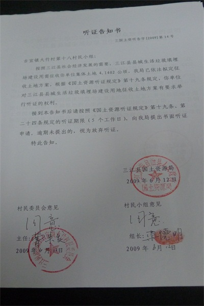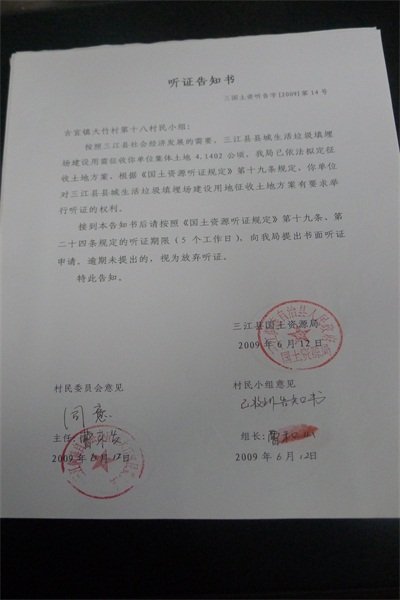听证告知书(三江侗族自治县城生活垃圾卫生填埋场建设用地)