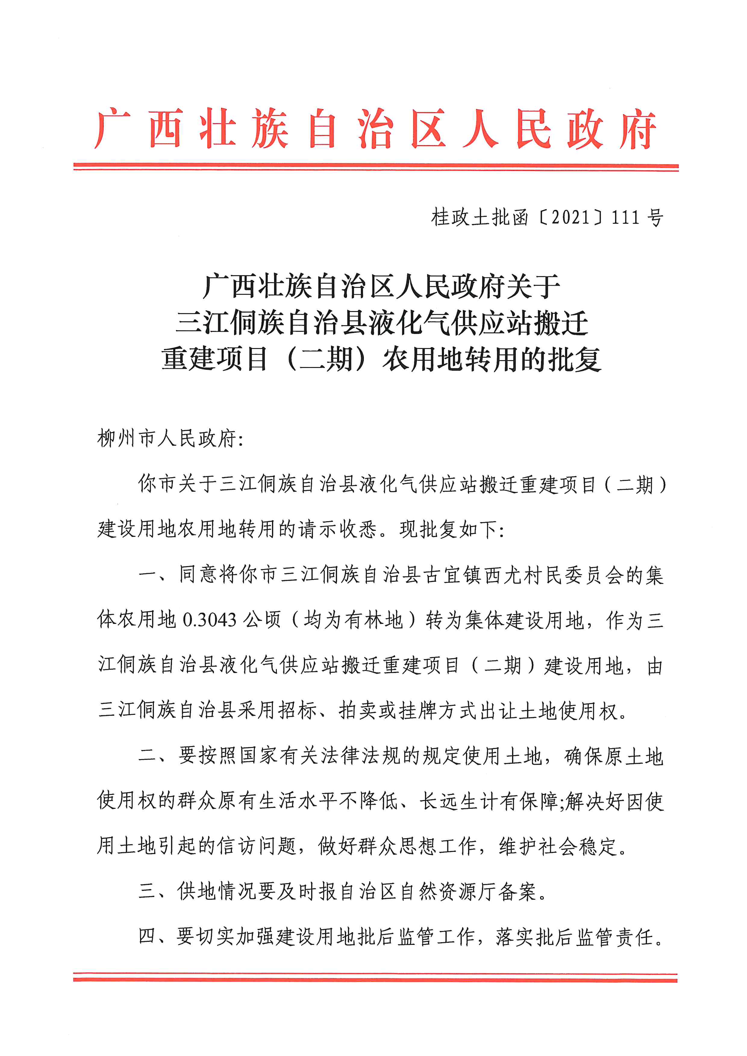 广西壮族自治区人民政府关于三江侗族自治县液化气供应站搬迁重建项目(二期)农用地转用的批复