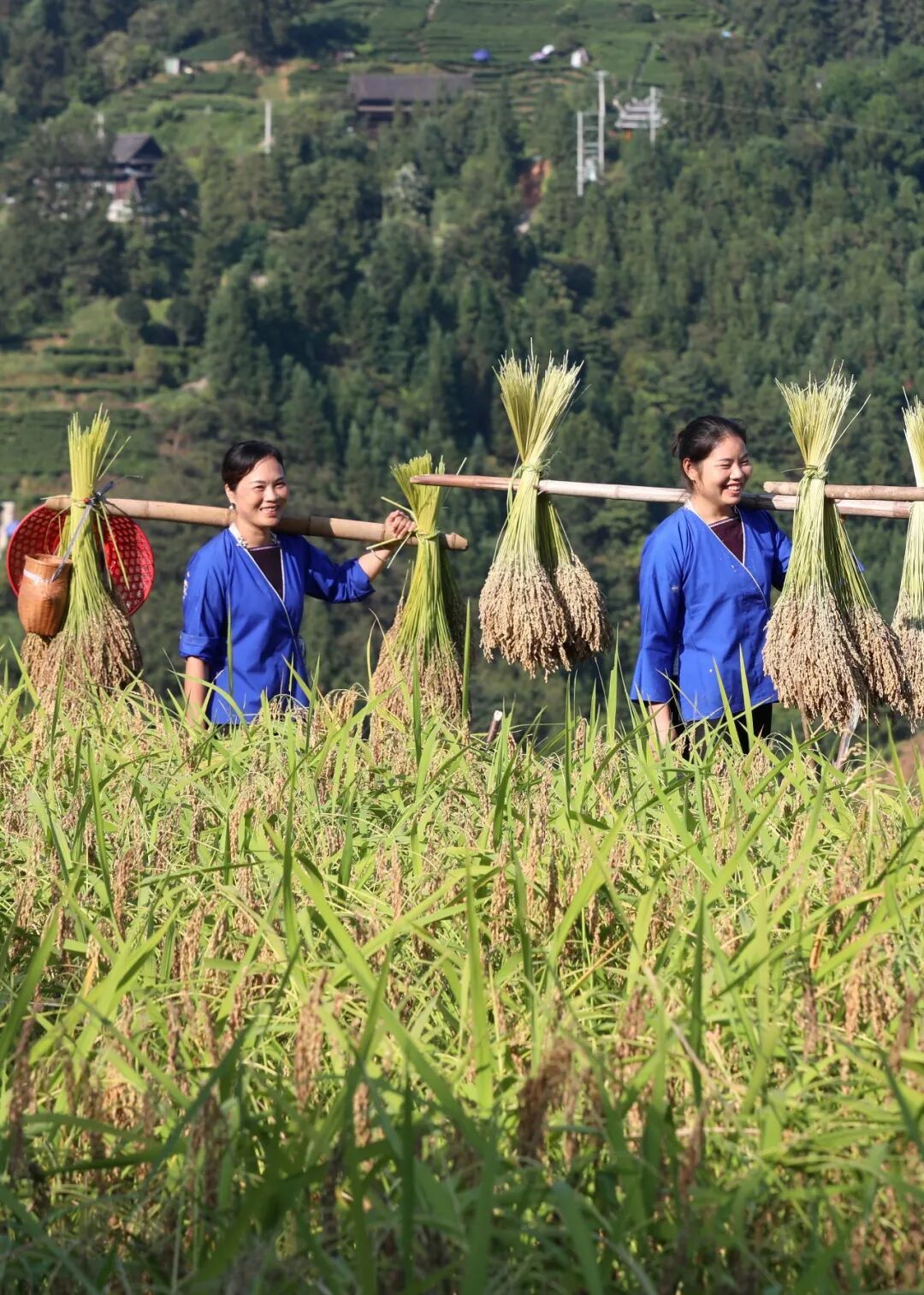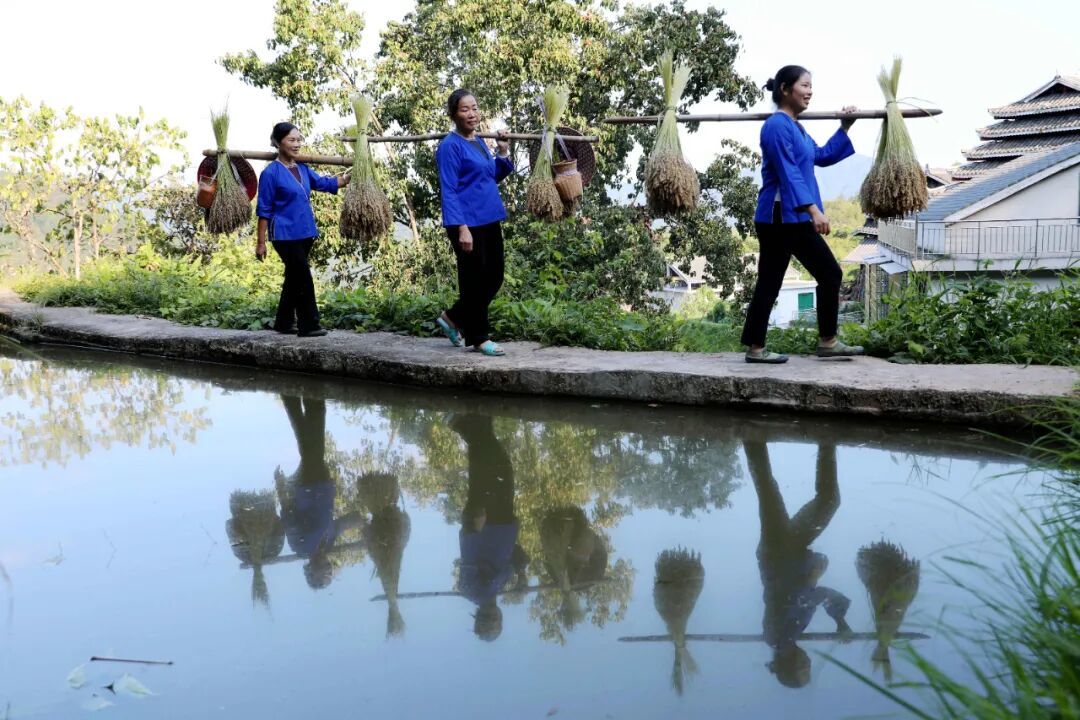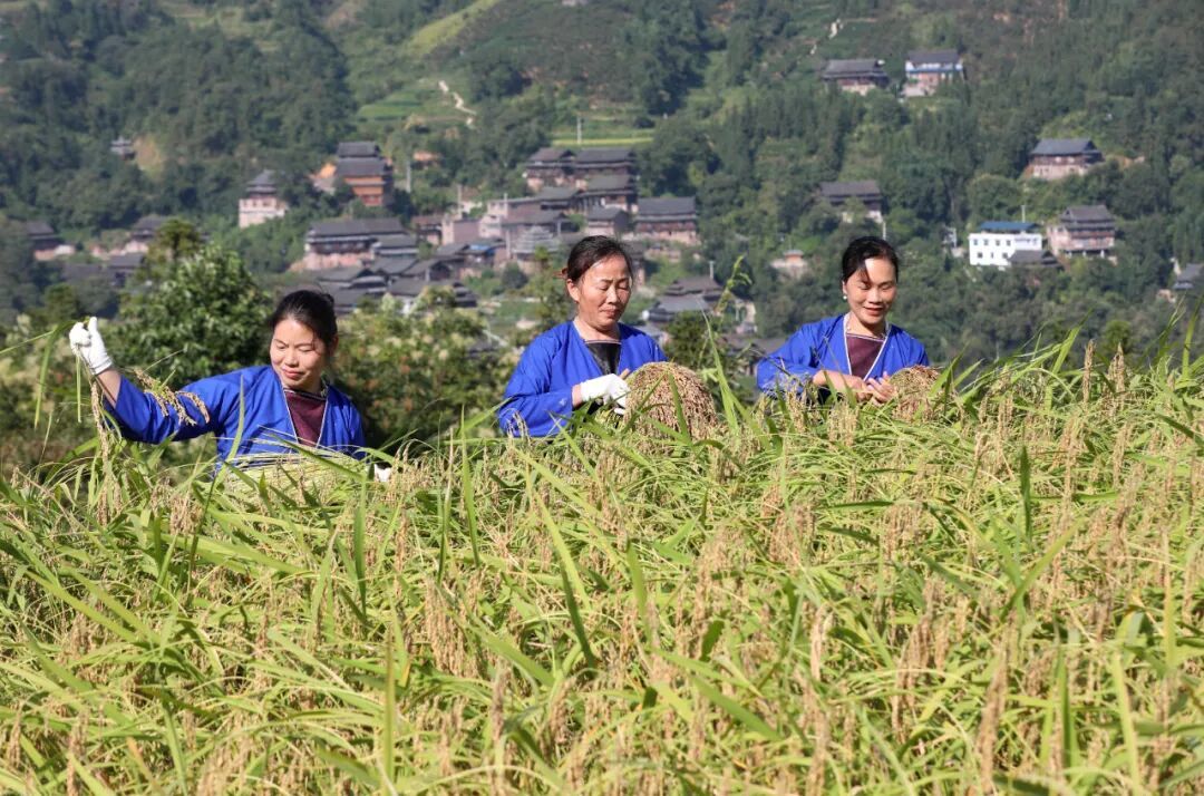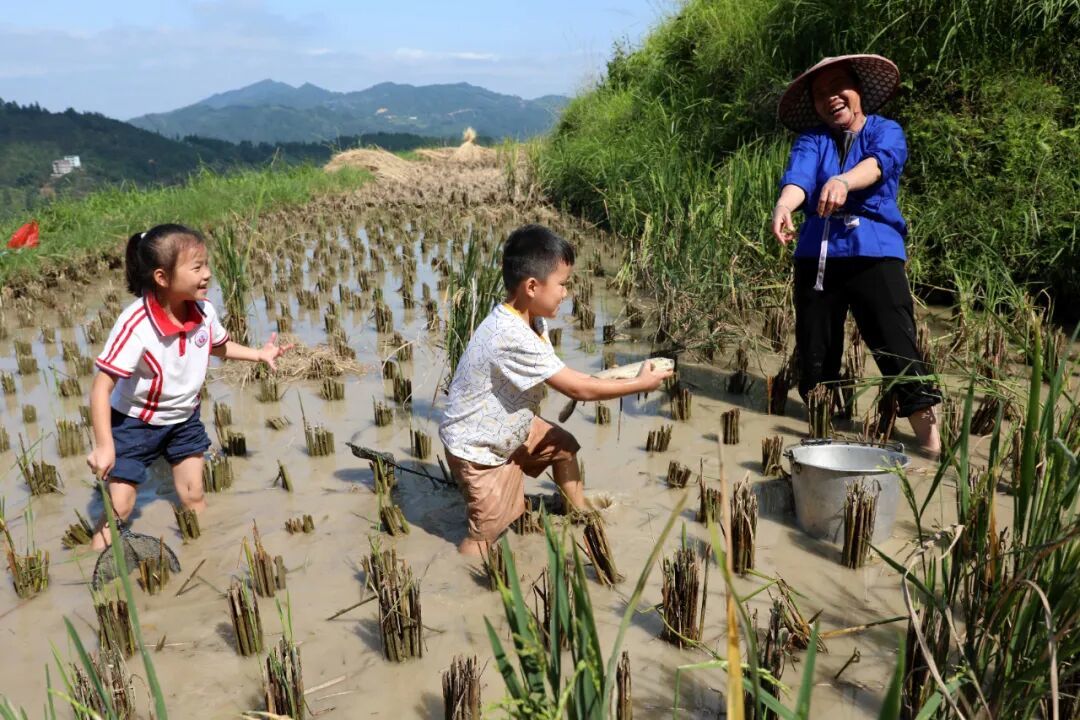 9月20日,三江侗族自治县八江镇归令村念马屯稻香鱼肥,村民们在田间剪禾、抓鱼,欢声笑语回荡山野,现场一派丰收景象。