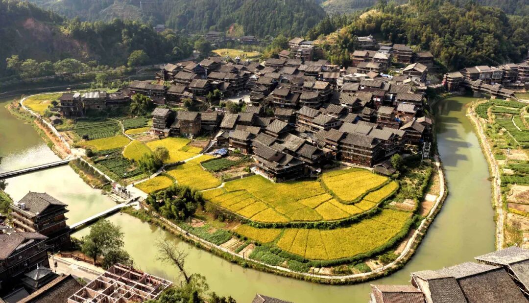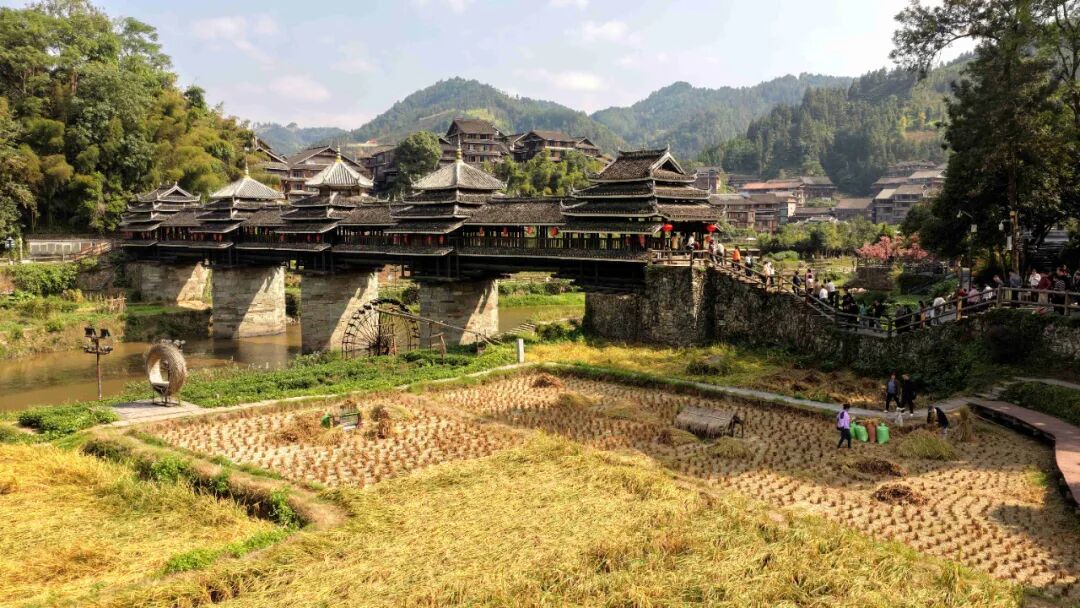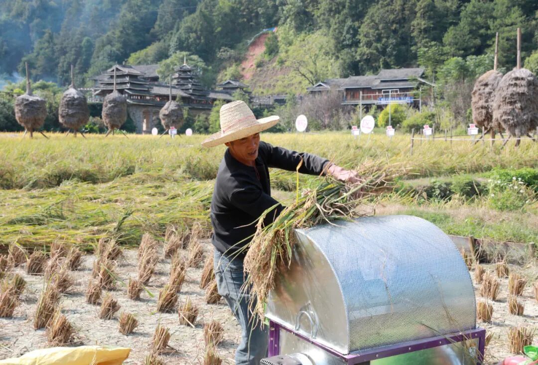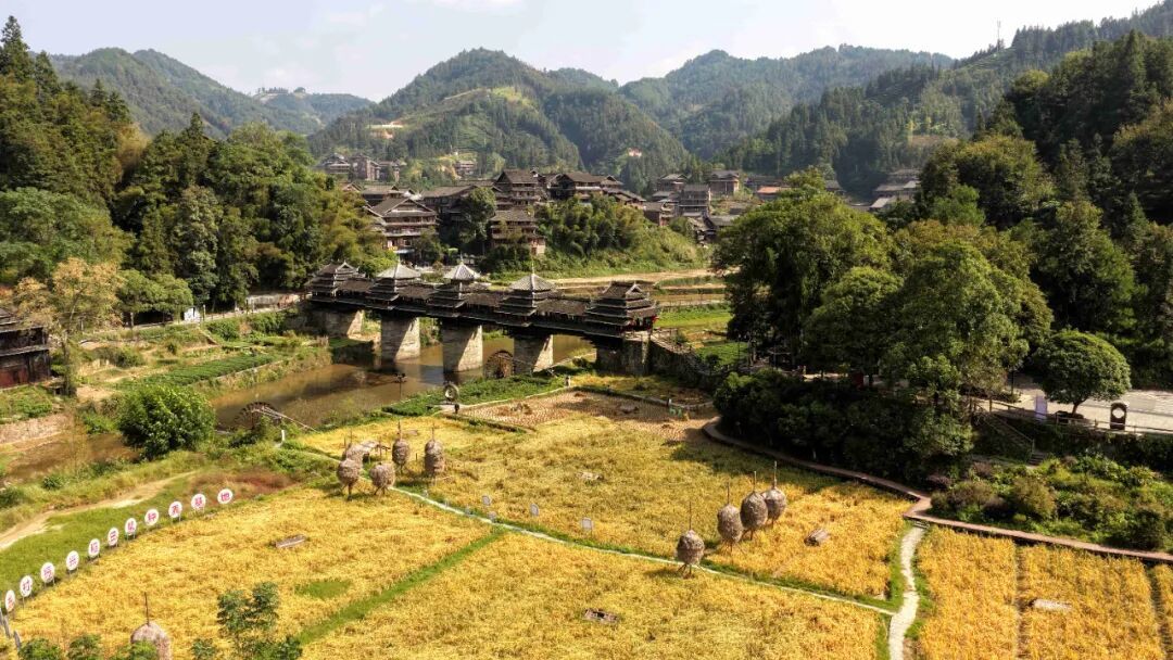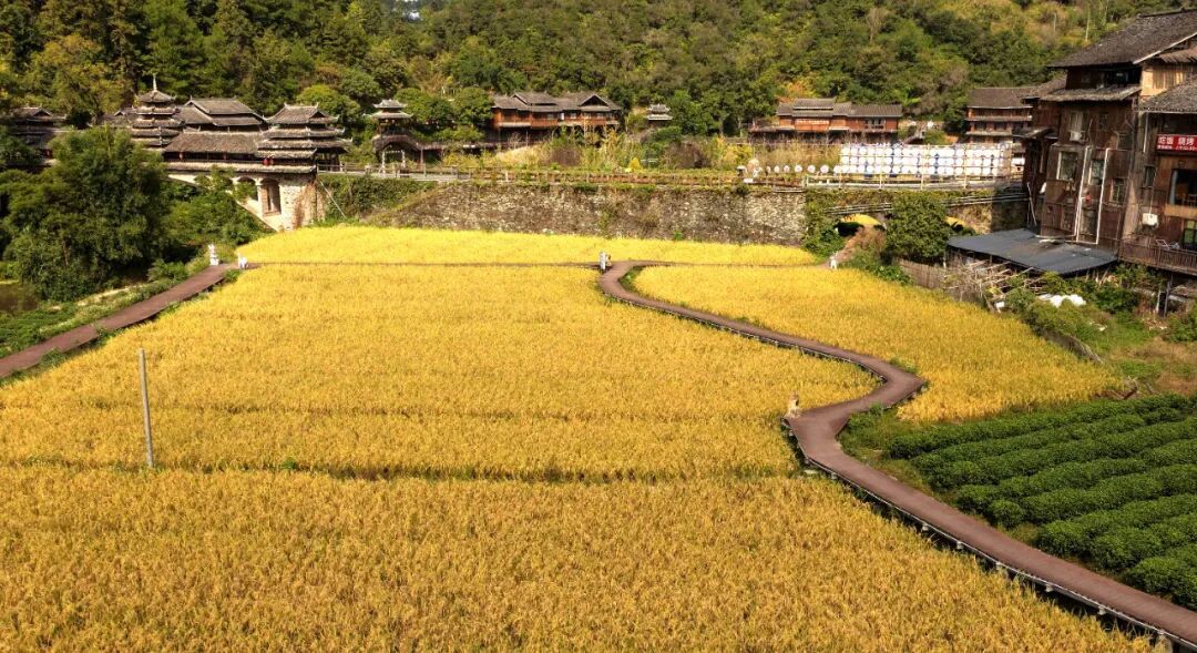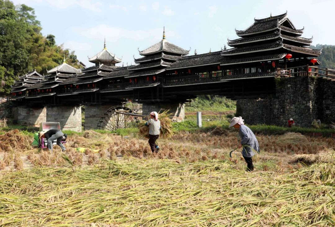 10月24日,三江侗族自治县林溪镇程阳八寨景区金黄稻田、古朴侗寨、蜿蜒溪流与村民田间劳作的忙碌身影相映成趣,绘就一幅诗意盎然的金秋画卷。
