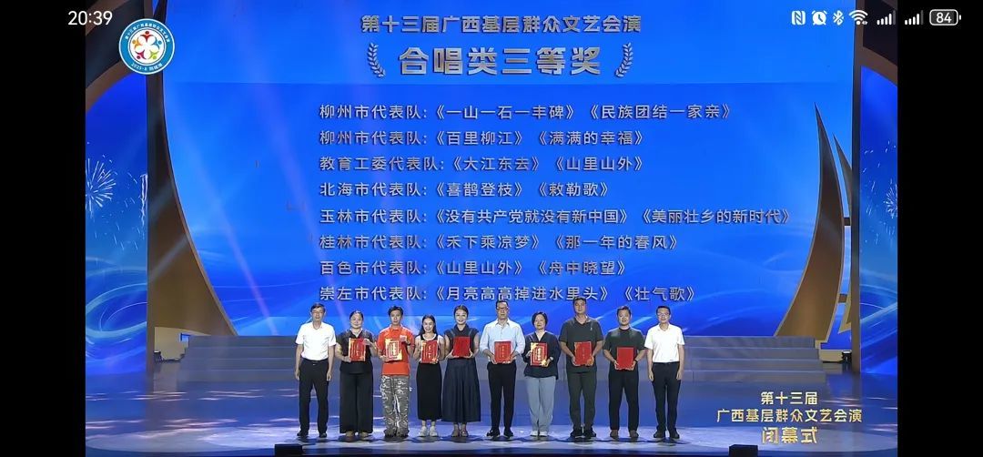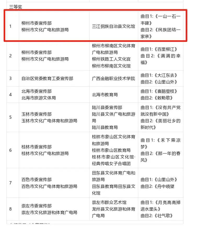 39支合唱队伍齐聚一堂,展开激烈角逐。三江侗族自治县代表队——三江侗族自治县文化馆馆办“侗韵之声”合唱团带来《一山一石一丰碑》《民族团结一家亲》两首曲目,用歌声诉说故事与情谊,在众多优秀队伍中脱颖而出,荣获三等奖!这不仅是团队的荣誉,更是对基层文艺力量的肯定。