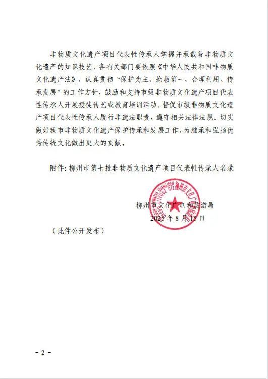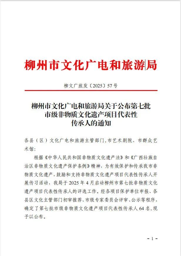 传承文脉,守护匠心。根据《中华人民共和国非物质文化遗产法》和《广西壮族自治区非物质文化遗产保护条例》精神,柳州市于2025年4月启动第七批非物质文化遗产项目代表性传承人评选工作。经过各项目保护单位申报、县区初审推荐、市级专家评审、公示等严谨流程,64名传承人最终入选,现正式公布!