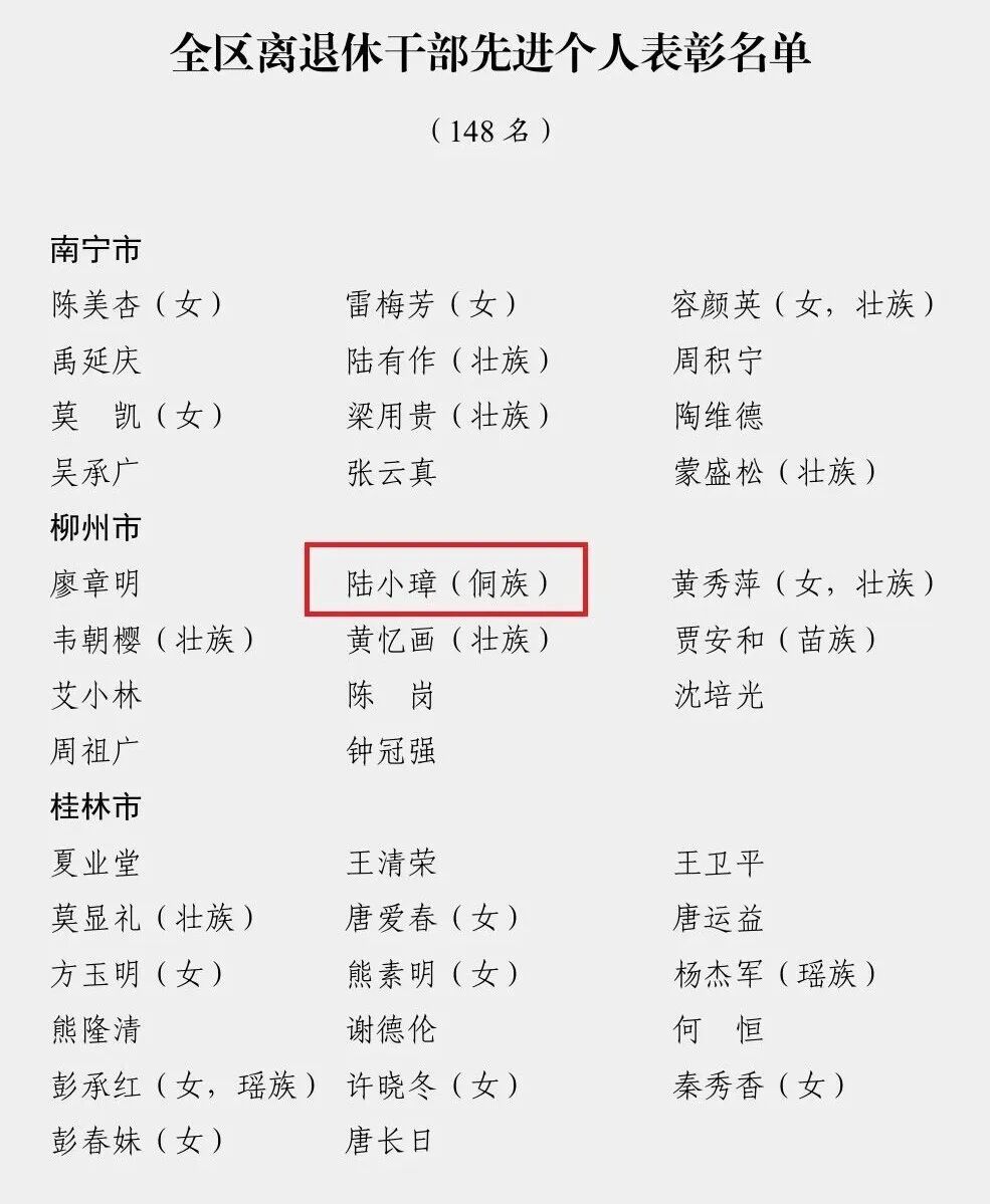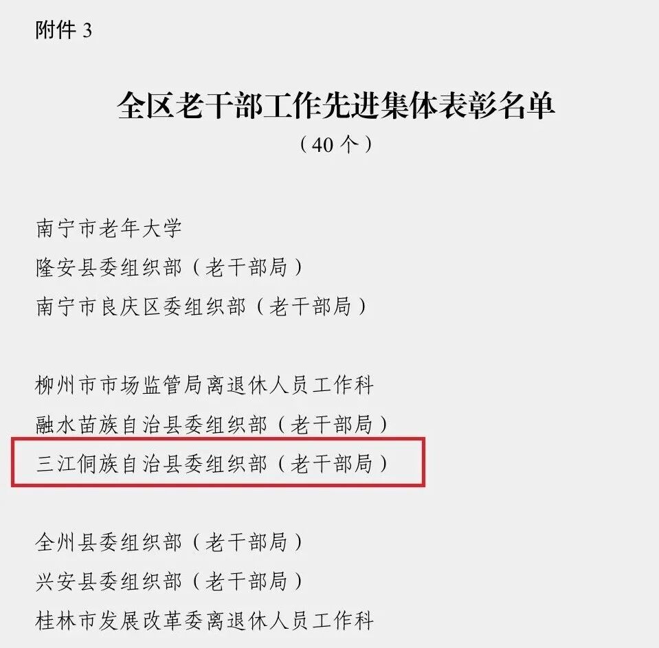 提要:近日,自治区党委组织部、自治区党委老干部局和自治区人力资源社会保障厅决定:授予南宁市政协机关第六党支部等50个离退休干部集体“全区离退休干部先进集体”称号,授予南宁市江南区人力资源和社会保障局陈美杏等148名离退休干部“全区离退休干部先进个人”称号,授予南宁市老年大学等40个单位“全区老干部工作先进集体”称号,授予南宁市政府办公室覃春菱等100名同志“全区老干部工作先进个人”称号。其中,三江侗族自治县委组织部(老干部局)获全区老干部工作先进集体表彰,陆小璋(侗族)获全区离退休干部先进个人表彰。