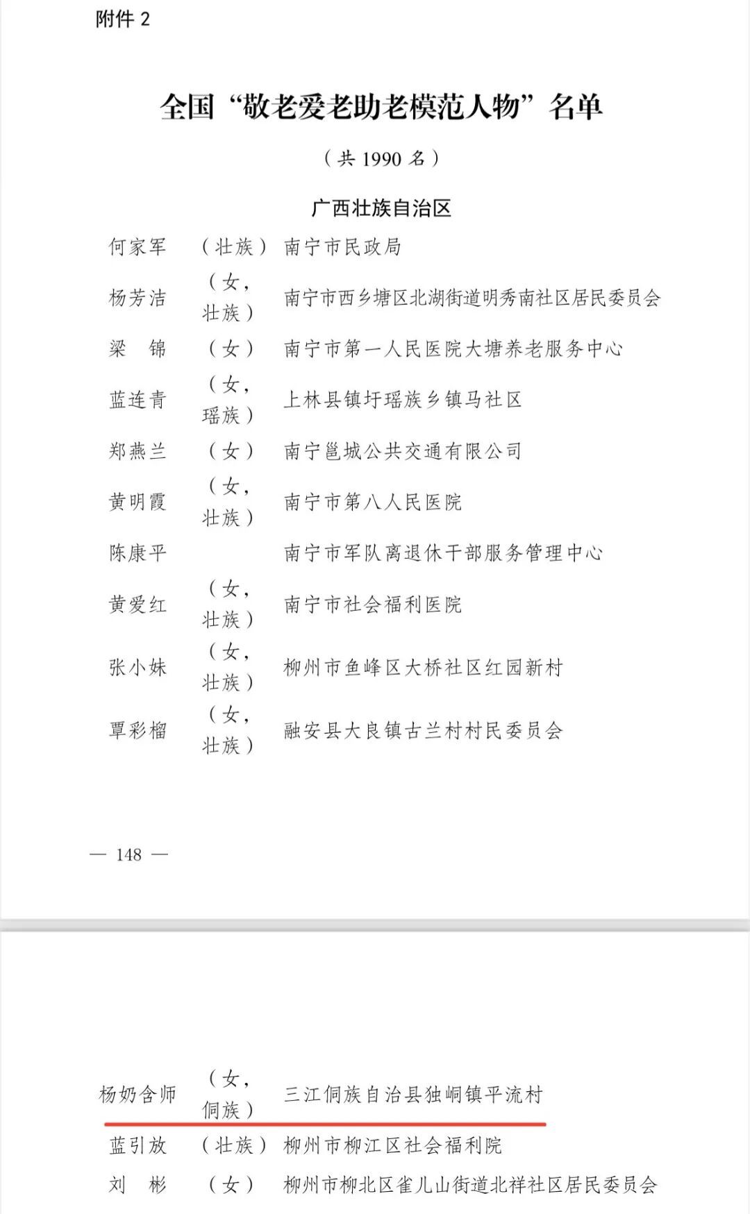 摘要:近日,全国老龄工作委员会办公室关于表彰全国“敬老文明号”和全国“敬老爱老助老模范人物”名单发布,来自三江侗族自治县独峒镇平流村的杨奶含师等1990余人,被授予全国“敬老爱老助老模范人物”称号。