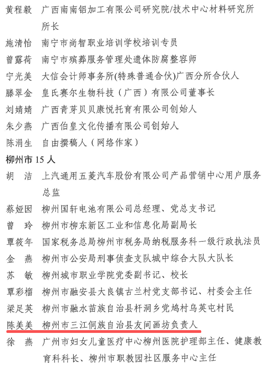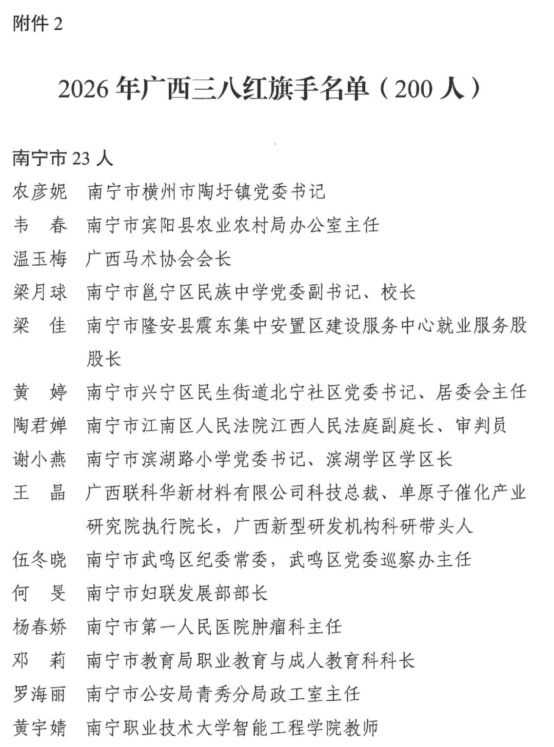 为表彰先进、树立榜样,激励广大妇女自尊自信、自立自强,奋进新征程、建功新时代,自治区妇联决定授予蒋三努等10人广西三八红旗手标兵称号,授予农彦妮等200人广西三八红旗手称号,授予南宁市良庆区良庆镇宋厢社区居民委员会等100个单位广西三八红旗集体称号。其中,柳州市三江侗族自治县友间画坊负责人陈美美荣获2026年广西三八红旗手称号。