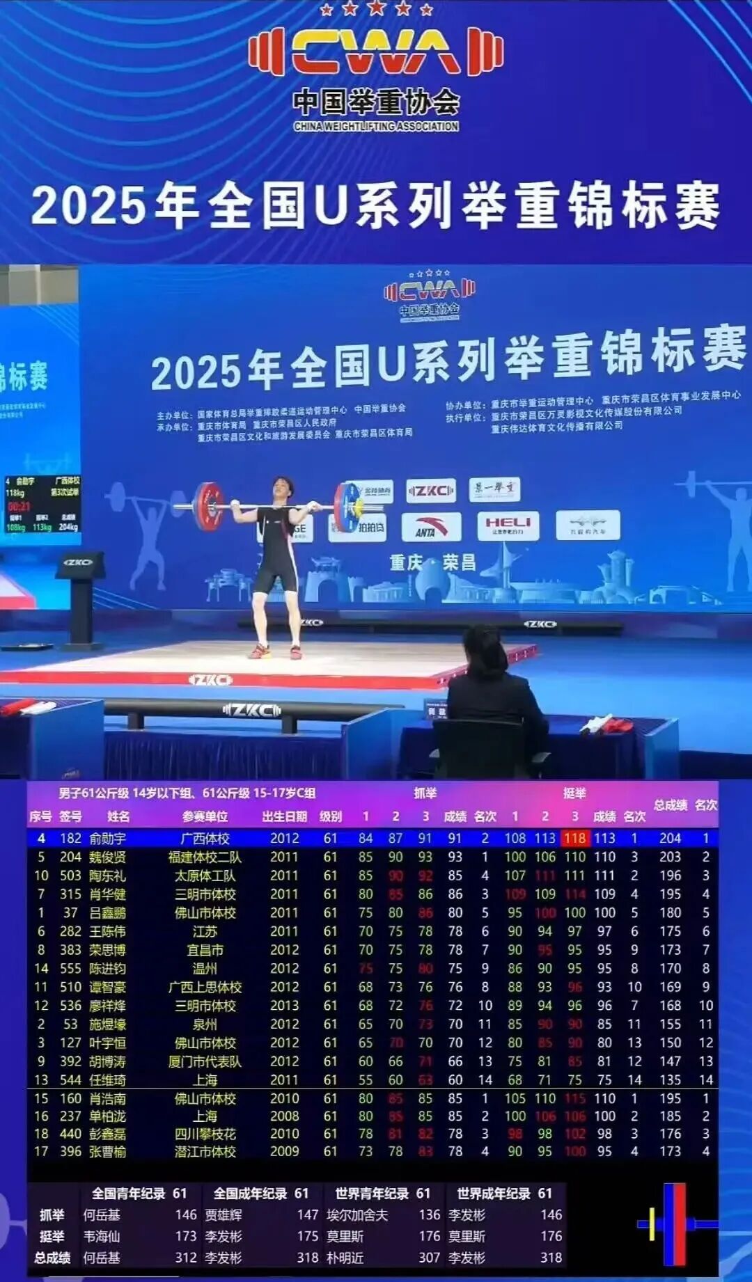 近日,2026年“景一杯”全国U系列举重锦标赛在湖北省宜昌市五峰土家族自治县举行,三江侗族自治县独峒镇干冲村牙戈屯苗族小将俞勋宇在男子14岁以下组65公斤级比赛中脱颖而出,以绝对实力强势包揽抓举、挺举、总成绩三项冠军,再续三江举重传奇。