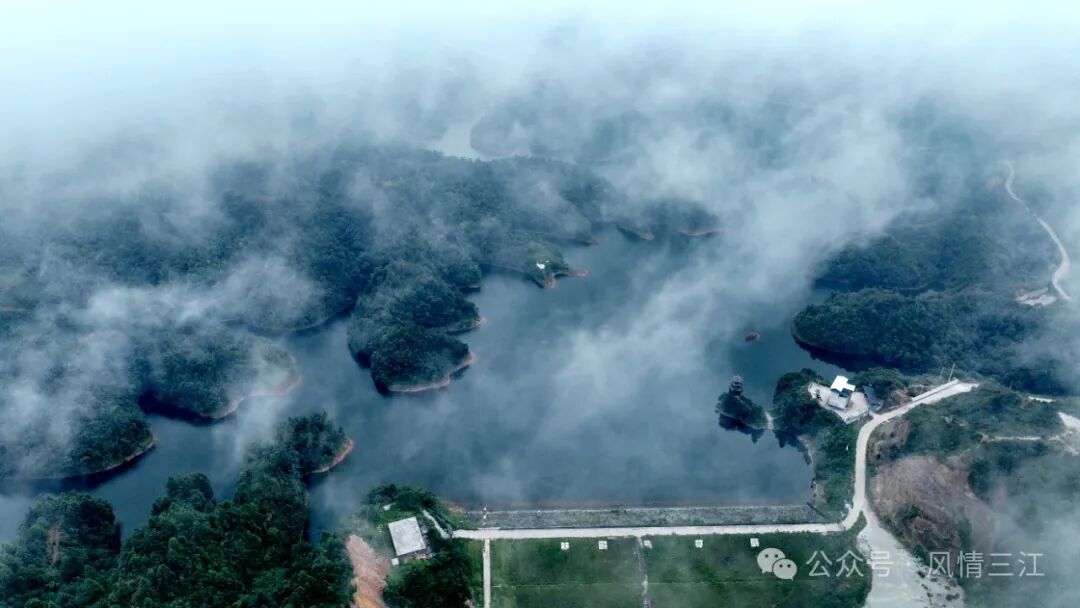 8月15日,无人机航拍的三江侗族自治县独峒镇大塘坳水库美景。当日正值第二个全国生态日,该水库上空云雾缭绕,如镜湖面、生态茶园、蜿蜒山路交相辉映,美不胜收。