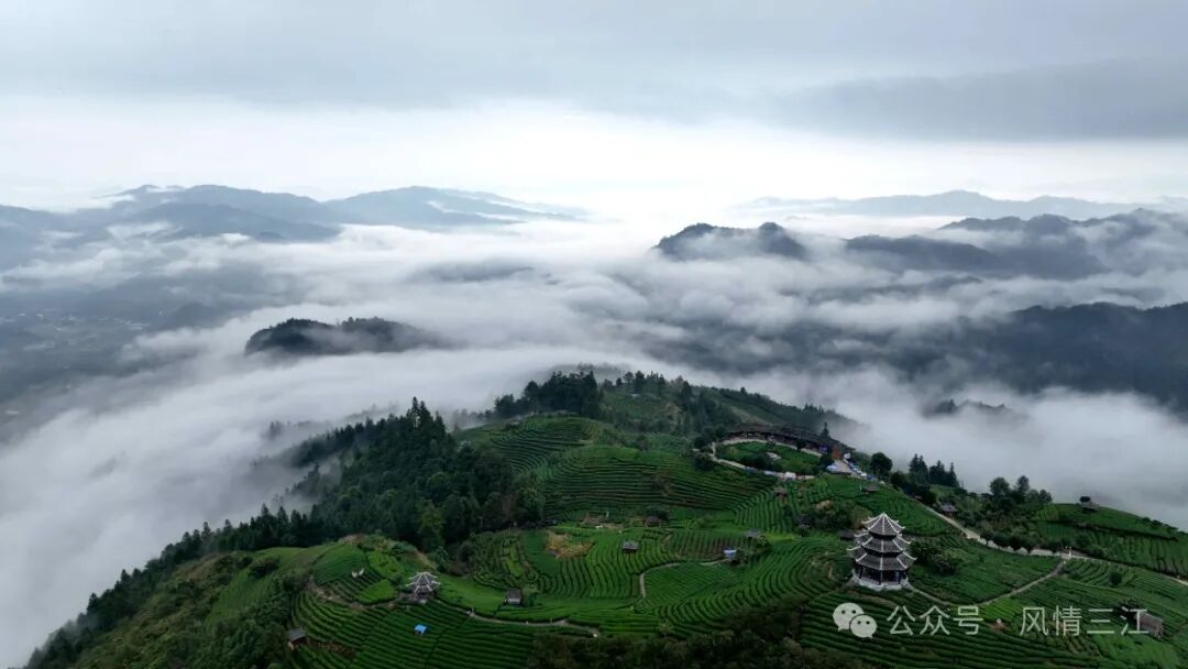 10月17日,一场秋雨过后,三江侗族自治县八江镇布央村仙人山茶园云雾缭绕,与层层叠叠的生态茶园、别具一格的特色廊亭等相映成趣,构成一幅迷人的秋日画卷,美如仙境。