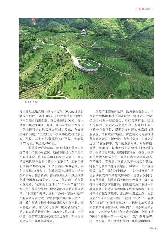 广西三江侗族自治县八江镇布央村是三江茶叶种植发源地,20世纪80年代末,布央村被列为三江县茶叶种植示范点。近年来,布央村坚持绿色发展之路,依托3900余亩生态茶园,以“三茶统筹”(茶文化、茶产业、茶科技)为引领,深化产权制度改革,创新实施“三股联营”模式,实现村民变股民,保障了农民长远利益;推进农村金融制度改革,助推村落变景区,成功创建国家AAAA级旅游景区,走上了旅游致富道路;引进先进科学技术,结合浓郁民族风情,探索茶文旅融合发展新模式,把一片“叶子”产业做大做强,“美丽茶山”变成“金山银山”。先后荣获“全国一村一品示范村”“中国名茶之乡”“全国休闲乡村旅游示范点”“广西五星级现代特色农业(核心)示范区”“自治区第五批民族团结进步示范村”等称号。